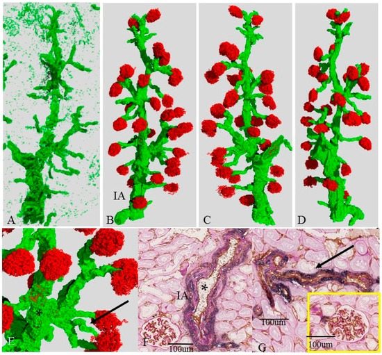 Vascular tree with decreased glomeruli (case 3). (A) Original 2D image of the section double-immunostained with anti-CD34 (brown) and anti-SMA (blue) and then PAS stain; (B) 3D reconstructed image of CD34. Glomeruli are round. Capillaries resemble a mesh network (red). Density of glomeruli is low; (C) 3D image of the vascular tree; (D–F) A single vascular tree with (E,F) or without (D) associated glomeruli; Red and green represent CD34 and SMA, respectively. All of the arteries show a regular SMA distribution and smooth surface. Arteries run straight. The branching angles of the afferent arterioles are sharp; (G) corresponding 2D image double-stained for CD34 and SMA with PAS stain. The diameter of the proximal interlobular artery is wide; and (A,G) corresponding 2D view reveals marked intimal fibrosis and medial atrophy; luminal area is preserved (A); and the arrow in (G) points to a bifurcation site and shows irregular intimal hyperplasia. Although the lumen seems narrow, the consecutive specimen reveals a large lumen, as seen in (A). The arrow and asterisk (*) correspond to the same symbols (A,C–G) and represent the interlobular artery and the atubular glomerulus in Figure 5, respectively.