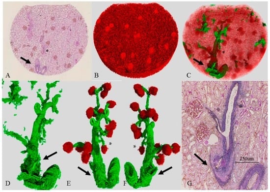 Figure 5 shows the 3D and 2D images of a single “atubular glomerulus” in case 3, which corresponds to the asterisks (*) in Figure 3E,F. Because of its long atrophic proximal tubule, the glomerulus was diagnosed as an “atubular glomerulus”. The 2D image (Figure 5C,F,G) proved that the glomerulus was small and exhibited shrinkage of the tuft and fibrous thickening of the Bowman capsule. The 3D and its corresponding 2D image confirmed the morphology of its supplying vessels. The interlobular artery had a large lumen with no definitive morphological changes in the 2D image (Figure 5C). In contrast, the afferent artery had a small diameter, and there was a great distance from the branching off of the interlobular artery (Figure 5A–C). The glomerulus had a small exit (*) near the afferent arteriole (Figure 5D,F), but we also found an extra exit apart from the afferent arteriole (arrows, Figure 5D–G). This extra exit is divided into several tiny capillaries soon after leaving the glomerulus and ran near the glomerulus (arrow, Figure 5A,B). Some were so tiny they could not be pursued (perhaps disappearing into the interstitium).