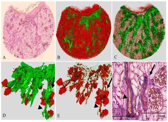 In the original 2D images, glomeruli were seen as tufts of capillaries positive for CD34 (brown) (Figure 1A,B). Arteries were identified as lumens with endothelial cells positive for CD34 (brown) surrounded by strongly expressed α-smooth muscle actin (SMA) (blue) in the media (Figure 1A,B).