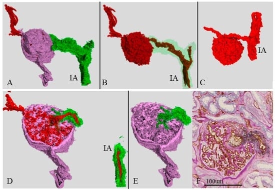 Three-dimensional image of abnormal efferent arteriole (Case 3). 3D images of a single glomerulus with abnormal efferent arterioles (A,B,D–F) in case 1; (A–E) Red, green, and pink are the CD34-positive endothelial cells, SMA-positive smooth muscle cells, and PAS-positive basement membranes of a Bowman capsule and glomerular basement membrane, respectively. IA is the interlobular artery. These structures correspond to the arrow in Figure 5C. The afferent arteriole is mildly distorted. Within the glomerulus, smooth muscle cells are still observed around the dilated afferent arteriole in the 3D view (D,E) and the 2D view (F); and the afferent arteriole is located apart from the efferent arteriole, whereas the arterioles were closely associated in case 1 (C).
