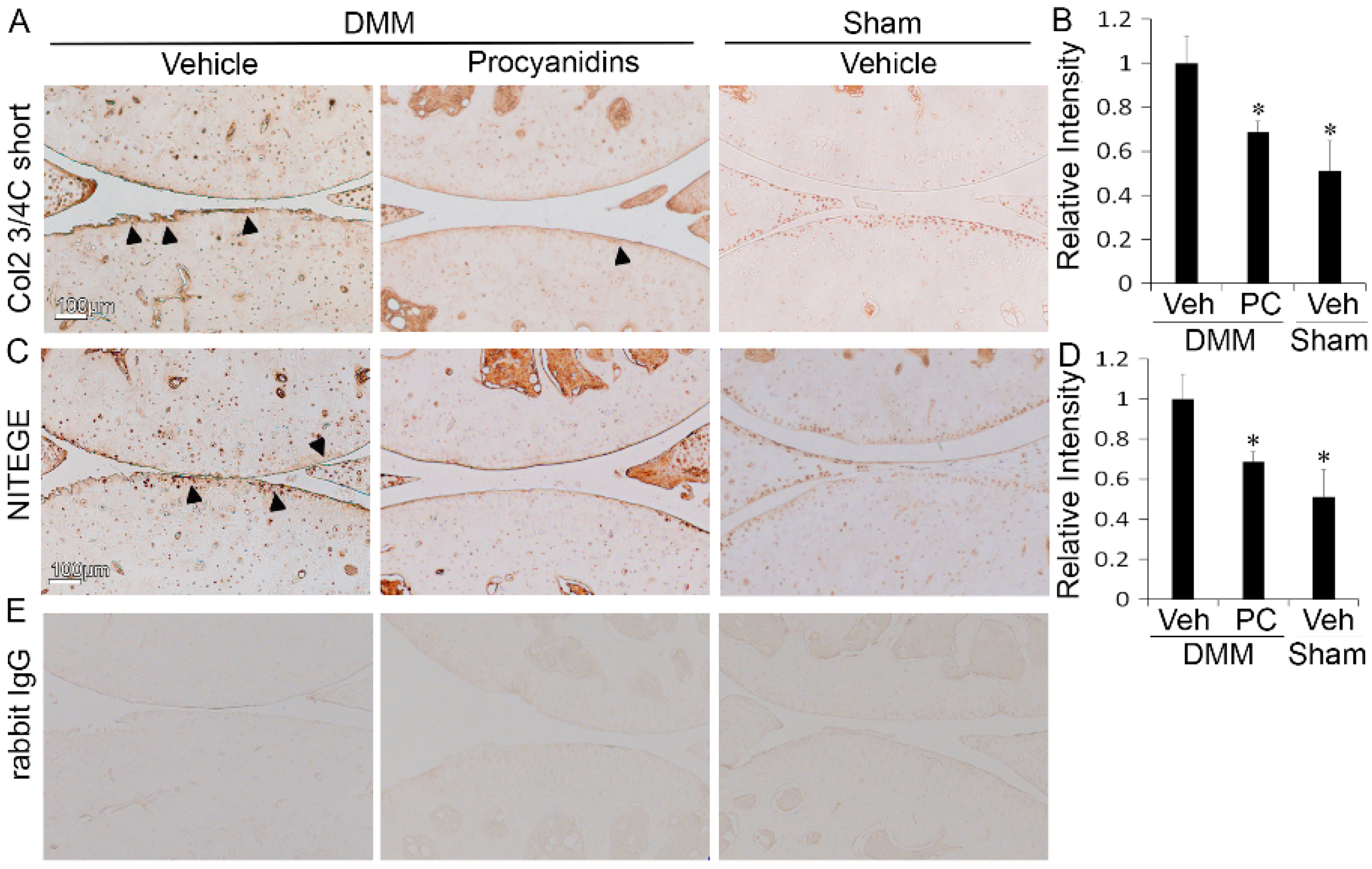 Oral administration of procyanidins reduced matrix degradation of articular cartilage in mice subjected to DMM surgery. Immunohistochemical staining of type II collagen cleavage epitope (Col2 3/4C short) (A) and cleaved aggrecan (NITEGE) (C); The relative staining intensities of Col2 3/4C short (B); and NITEGE (D) of the articular cartilage matrix in mice subjected to DMM and treated with procyanidins (PC) were significantly reduced compared to that in mice subjected to DMM and treated with vehicle (Veh); (E) representative immunostaining of tissue sections with isotype control (rabbit immunoglobulin G, IgG). Scale bar = 100 µm. * p < 0.05 by one-way ANOVA with Tukey post-hoc test; n = 4/group. Arrows denote representative regions with positive immunostaining of type II collagen cleavage epitope (Col2 3/4C short) (A) and cleaved aggrecan (NITEGE) (C).
