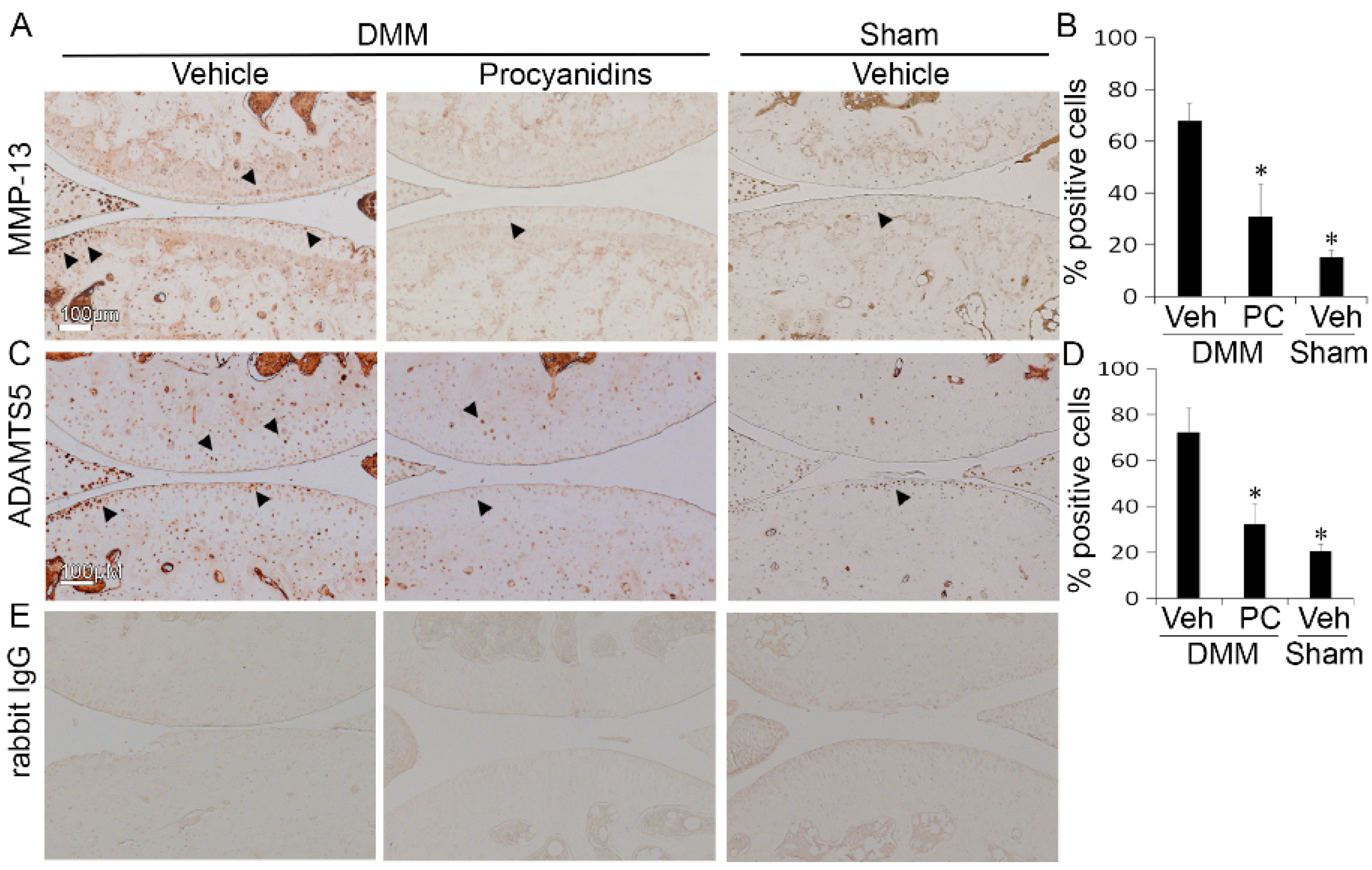 Oral administration of procyanidins reduced protein levels of matrix metalloproteinase (MMP)-13 and a disintegrin and metalloproteinase with thrombospondin motifs 5 (ADAMTS5) in articular cartilage of mice subjected to DMM surgery. Immunohistochemical staining of MMP-13 (A); and of ADAMTS5 (C) and percentage of positive cells (B,D) in the articular cartilage of mice subjected to DMM and treated with procyanidins (PC) was significantly reduced compared to that in mice subjected to DMM and treated with vehicle (Veh); (E) representative staining of tissue sections with isotype control (rabbit immunoglobulin G, IgG). Scale bar = 100 µm. * p < 0.05 by one-way ANOVA with Tukey post-hoc test; n = 4/group. Arrows indicate representative chondrocytes with positive immunostaining for MMP-13 (A) or ADAMTS5 (C).