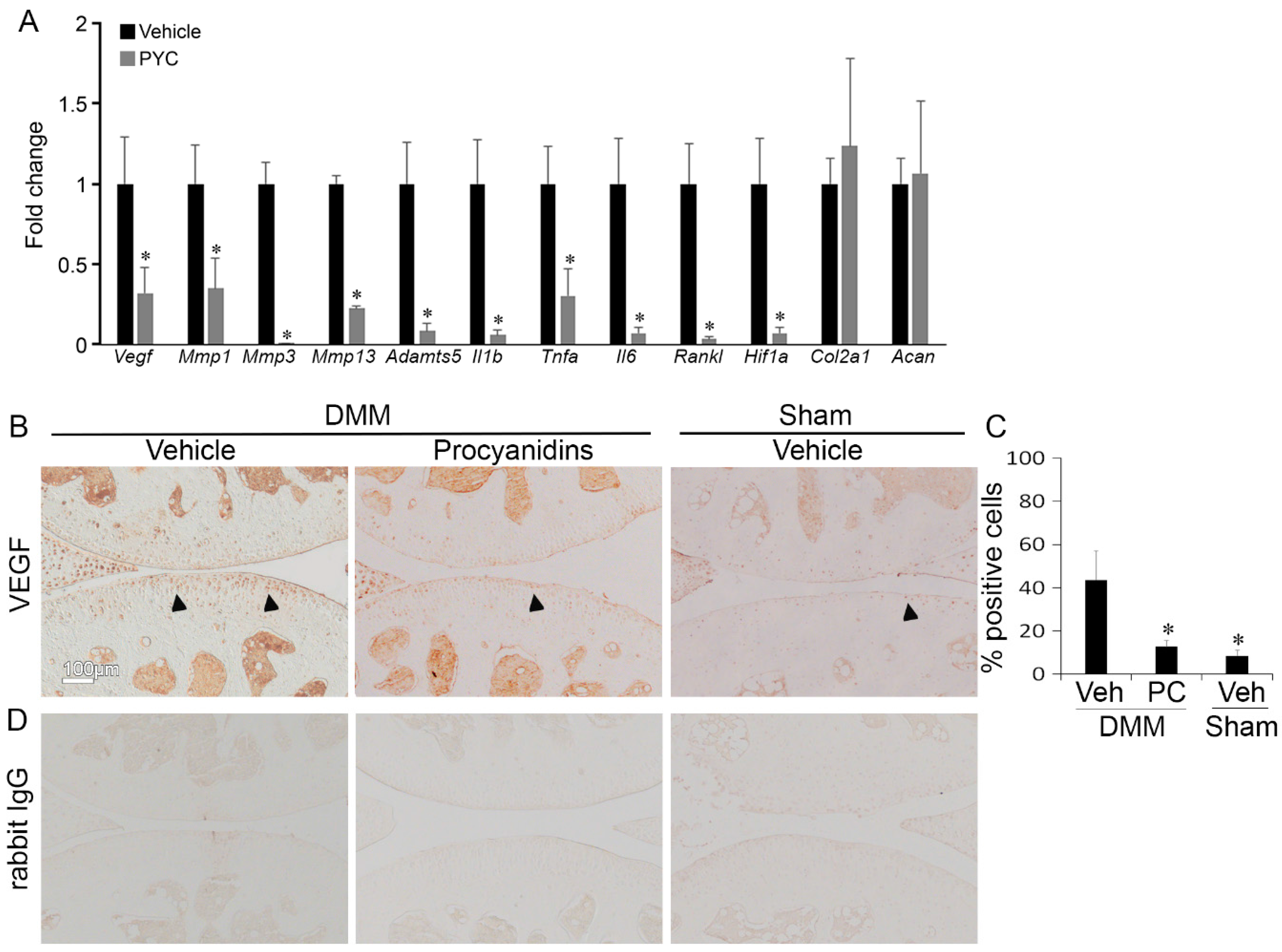 The aim of this study was to test the hypothesis that procyanidins prevent and/or mitigate OA pathogenesis by, at least in part, suppressing VEGF. We tested this hypothesis in vivo using destabilization of the medial meniscus (DMM)-induced OA mice, and in vitro using human primary OA chondrocytes.