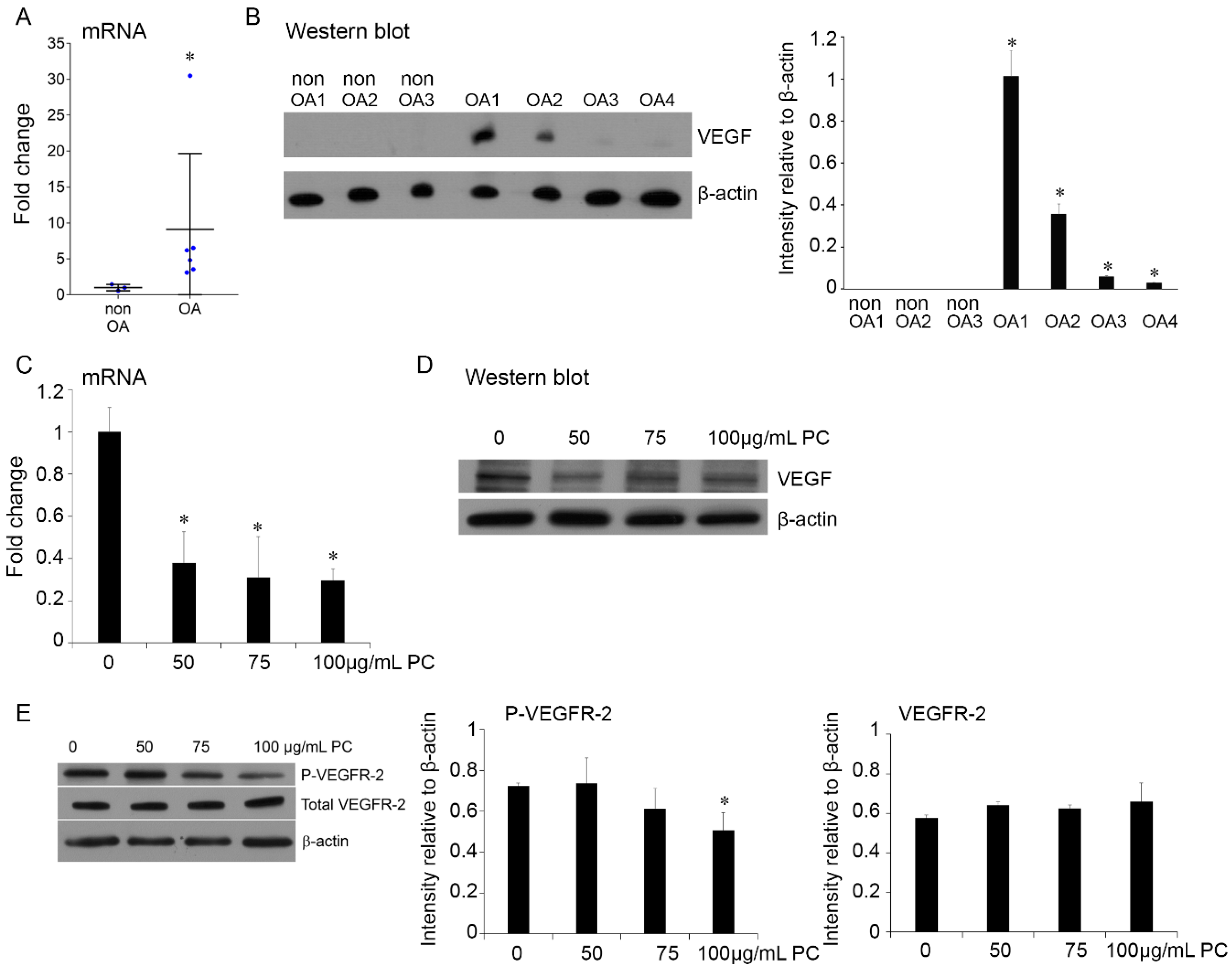 Procyanidins inhibited expression of VEGF and phosphorylation of VEGF receptor-2 in primary human OA chondrocytes. VEGF mRNA expression (A) and protein level (B) were significantly elevated in primary human OA chondrocytes compared to non-OA chondrocytes. Procyanidins (PC) inhibited VEGF mRNA expression (C) and protein expression (D) and phosphorylation of vascular endothelial growth factor receptor 2 (P-VEGFR-2) (E) in cultured primary human chondrocytes in the presence of human recombinant IL-1β (10 ng/mL). Western blot and quantifications of three representative Western blots are shown. * p < 0.05 vs. controls, one-way ANOVA with Tukey post hoc test.