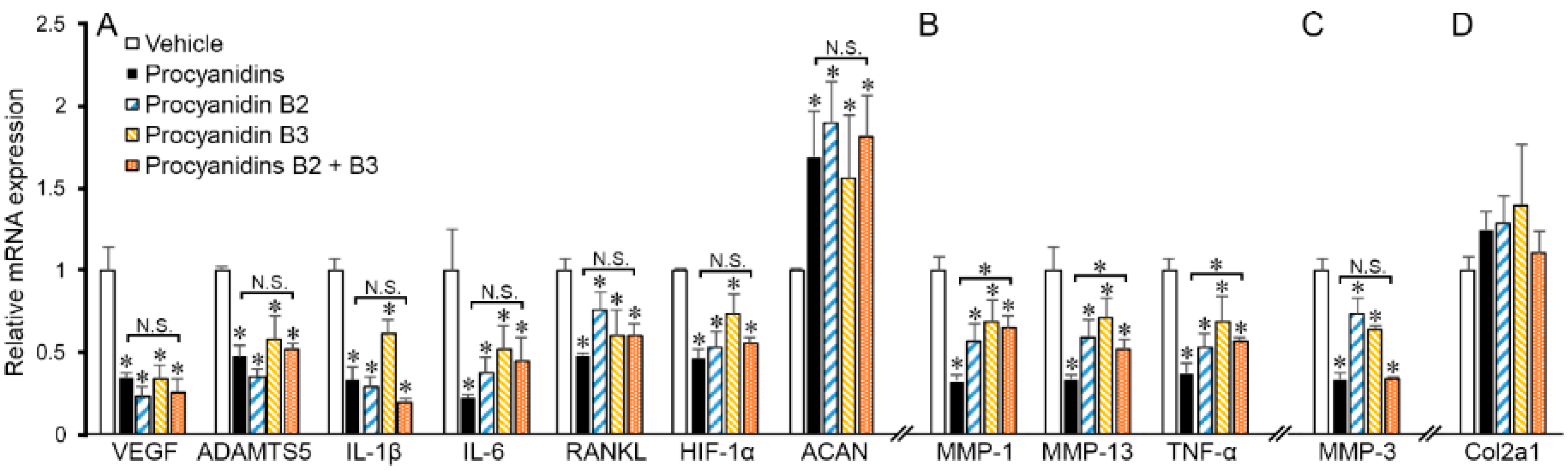The effects of procyanidin B2 and B3 on expression of VEGF and genes that may be regulated by VEGF and involved in OA pathogenesis compared to those of procyanidins in primary human OA chondrocytes in the presence of human recombinant VEGF. mRNA expression of (A) VEGF, ADAMTS5, IL-1β, IL-6, RANKL, HIF-1α and aggrecan (ACAN); (B) MMP-1, MMP-13, TNF-α; (C) MMP-3; and (D) Col2a1 in human primary OA chondrocytes treated with procyanidins (50 µg/mL), procyanidin B2 (1 µg/mL), procyanidin B3 (1.25 µg/mL) and procyanidins B2 + B3 (1 and 1.25 µg/mL respectively) in the presence of human recombinant VEGF (10 ng/mL). (* p < 0.05 vs. vehicle control or indicated comparison, one-way ANOVA with Tukey post-hoc test; N.S.: not significant, p > 0.05; n = 3/group).
