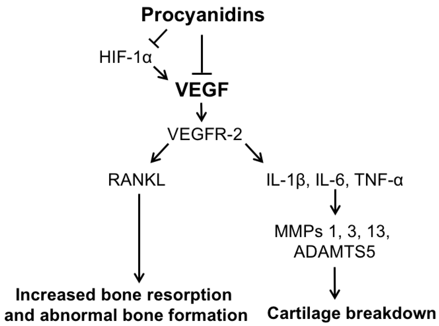 Hypothesized mechanism of procyanidin-mediated mitigation of OA pathogenesis. Procyanidins suppress expression of VEGF-mediated signaling by suppressing expression of VEGF and phosphorylation of VEGFR-2, and/or indirectly by reducing expression of HIF-1α. Suppression of VEGF-mediated signaling downregulates expression of VEGF and its signaling pathway associated mediators, including pro-inflammatory cytokines IL-1β, IL-6, and TNF-α, and proteolytic enzymes MMP-1, -3, -13, and ADAMTS5, which cleave components of the cartilage extracellular matrix. Procyanidins also suppress VEGF-induced RANKL, preventing increased bone resorption and abnormal bone formation.