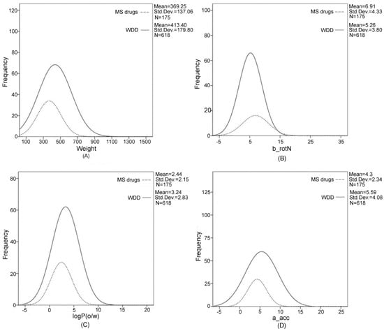 Additionally, the drug-likeness analysis was also performed to evaluate the oral drug-like property of chemical ingredients in WDD using the Lipinski rule of five, that is, molecular weight lower than 500 Da, number of H-bond donors (a don) less than five, number of H-bond acceptors (a_acc) less than 10, number of rotatable bonds (b_rotN) lower than 10 and octanol-water partition coefficient (logP(o/w)) lower than five, is of importance for the screening of drugs with pharmacological activity [21,22]. The drug-like property descriptors of WDD ingredients were listed in Table 2. All mean and median values of five such descriptors were coincided with the five rules of oral medications. Among them, 75.1% of the compounds had a molecular weight <500, 87.1% had <10 H-bond acceptors, 83.2% had less than 5 H-bond donors, 78.3% had a LogP of less than five, and 92.9% had <10 b_rotN, respectively. Next, to provide insight into the absorption, distribution, metabolism, excretion and toxicity (ADMET) properties of these ingredients, these five drug-like properties of the ingredients in WDD were compared with synthesis drugs concerning MS diseases approved by FDA (Figure 1A–E) [22,23,24]. The overall shapes of the distributions of these characteristics were similar between the ingredients in WDD and MS related drugs, but the standard deviations for ingredients in WDD were larger than for MS drugs except b_rotN. This result indicated that the weight, H-bond acceptors, H-bond donors and water solubility of ingredients in WDD were more variable than those of MS drugs. The proportion of compounds with more than 10 rotatable bonds (b_rotN) in WDD exceeded MS drugs, which meant the structures of ingredients in WDD were more flexible. Thus, it can be concluded that the ingredients in WDD possessed chemical diversity and drug-likeness compared to MS drugs approved by FDA.