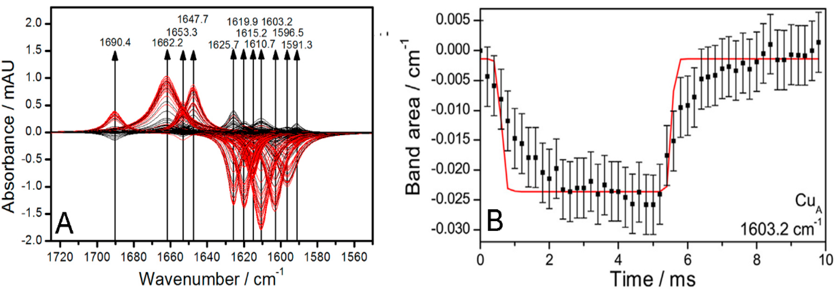 Time-resolved surface-enhanced infrared absorption spectroscopy (tr-SEIRAS) spectra of the activated cytochrome c oxidase (CcO) under anaerobic conditions. Spectra of the first excitation half period (oxidation) are shown in red, and those of the second half period (reduction) are shown in black. Spectra were taken over time intervals of 200 µs. Reproduced with permission from Schwaighofer et al. (2013) [19].