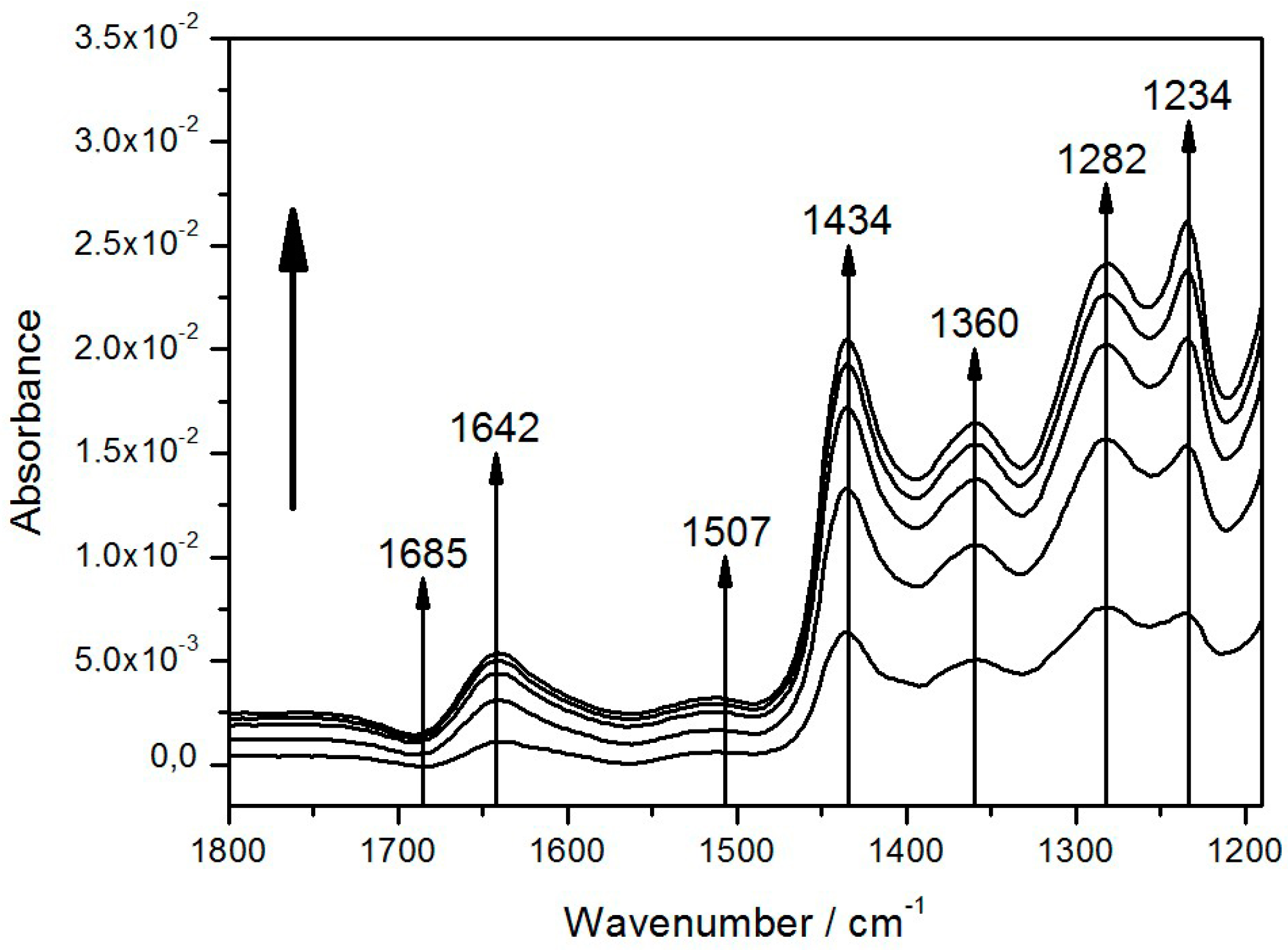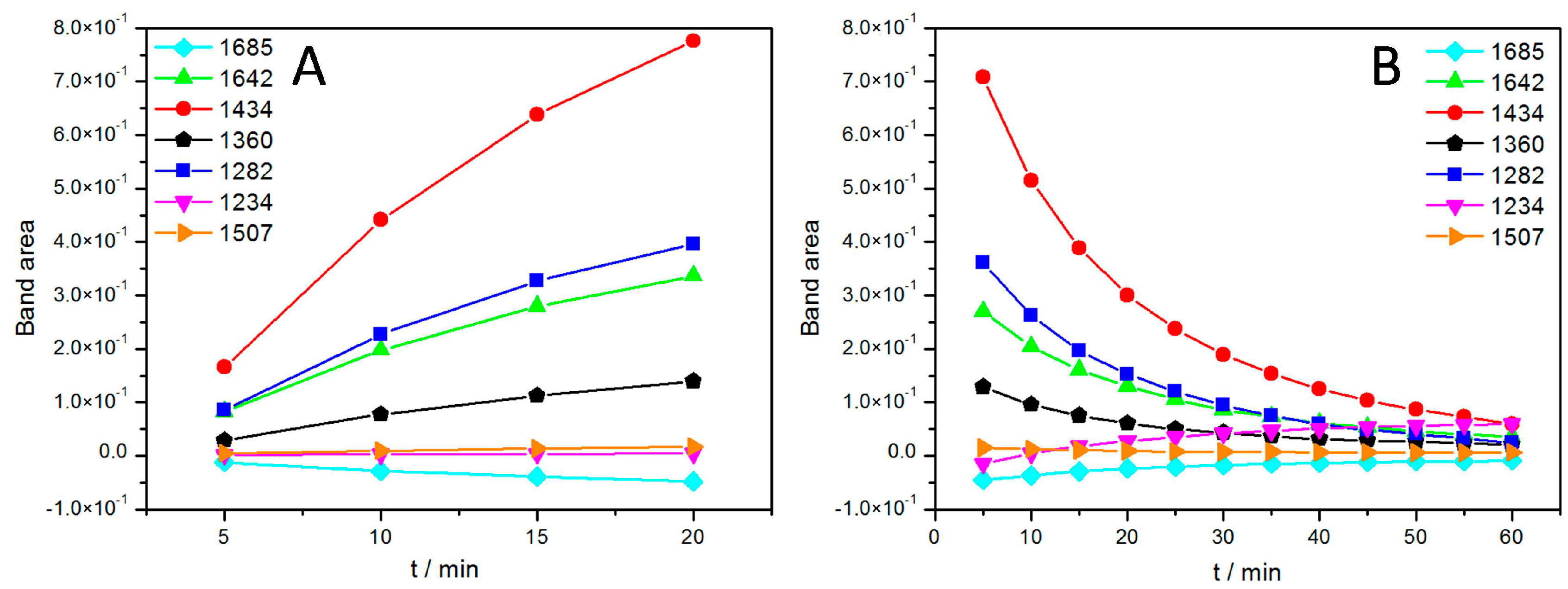 The growth of the band areas was fully reversible, when the light was switched off, as shown in Figure 5B. Most band areas are reduced in the course of the relaxation with the exception of the bands at 1234 and 1685 cm−1, which are restored. This unexpected behavior combines several features characteristic for the SEIRA spectra of the ptBLM. Above all, the general pattern of the spectra is obviously different from the pattern of FTIR difference spectra usually displayed in the literature, which is mostly composed of narrow peaks and troughs [30].