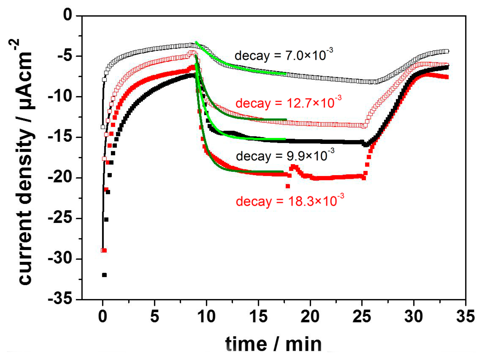 Photocurrents of RCs immobilized on a nitrilo-tri-acetic acid (NTA) modified template stripped gold (TSG) measured before (black) and after (red) formation of the ptBLM, at −200 mV (open squares) and −300 mV (full squares). Green lines are the monoexponential fits of the data. Reproduced with permission of Gebert et al. (2015) [33].