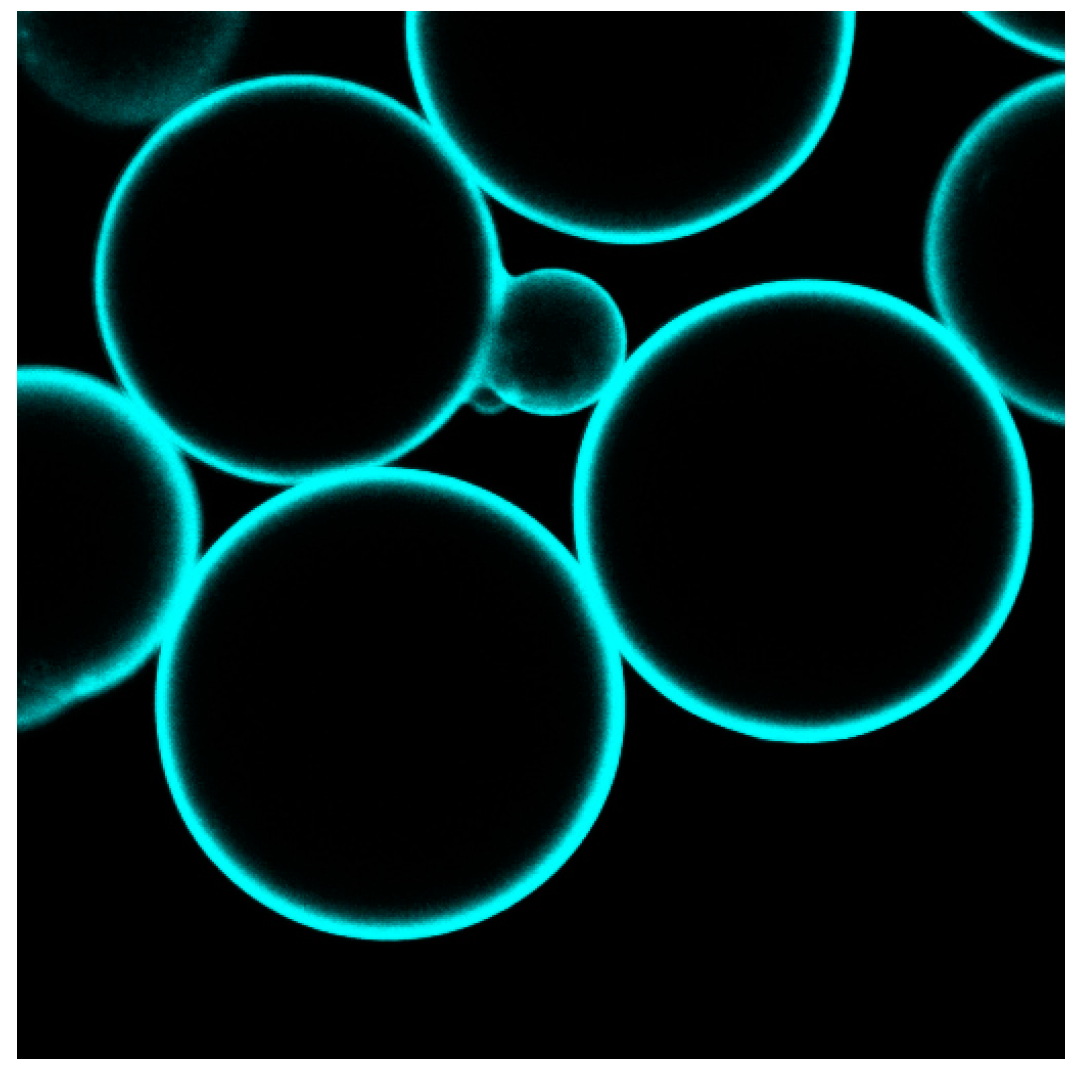 Confocal laser scanning microscopy (LSM) images of PLBs based on agarose beads. PLBs are labeled with the potential-sensitive dye di-4-ANBDQBS (4-(1-[2-(di-n-butylamino)-6-naphthyl]-4-butadienyl)-1-(4-butylsulfonate) quinolinium betaine). Reproduced with permission of Frank et al. (2015) [37].