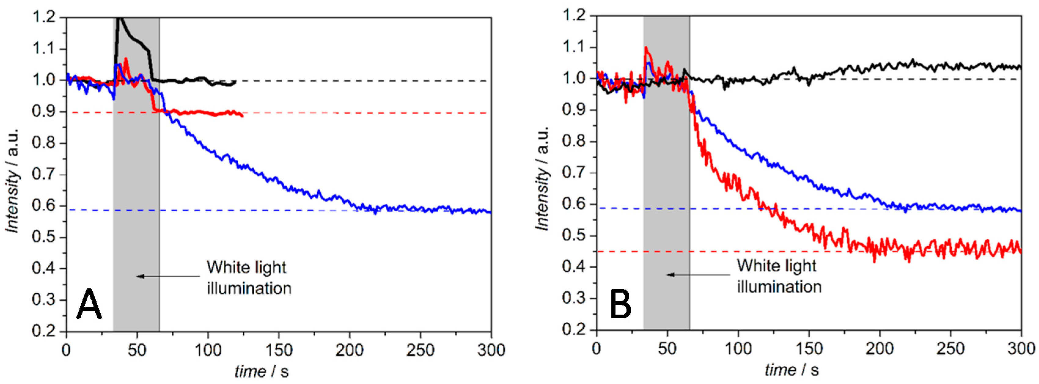 Change in the relative fluorescence intensity of membrane-bound pH-sensitive fluorescein DHPE ((1-(8-((3′,6′-dihydroxy-3-oxo-spiro(isobenzofuran-1(3H),9′-(9H)xanthen)-5-yl)amino)-3-hydroxy-8-thioxo-2,4-dioxa-7-aza-3-phosphaoct-1-yl)-1,2-ethanediyl ester, P-oxide) over time, before and after continuous illumination with a halogen lamp. (A) Comparison of unbuffered (40 mM KCl) (blue) and buffered (35 mM KCl, 5 mM Tris-HCl) (red) PLB solutions, each of them containing Ru2C ([(bpy)2Ru(diphen)Ru(bpy)2](PF6)4), 3CP (3-carboxy-PROXYL) and aniline to enable light excitation, and buffered PLB solution without the Ru2C, 3CP and aniline (black); (B) Change in the relative fluorescence intensity of pH-sensitive membrane bound fluorescein DHPE over time, before and after continuous illumination with a halogen lamp with Ru2C, 3CP and aniline in a 40 mM KCl solution (blue), in the presence of valinomycin alone (red) and with both valinomycin and FCCP (carbonyl cyanide 4-(trifluoromethoxy)phenylhydrazone) (black). The pH was adjusted to 8 before all measurements. Reproduced with permission of Frank et al. (2015) [37].