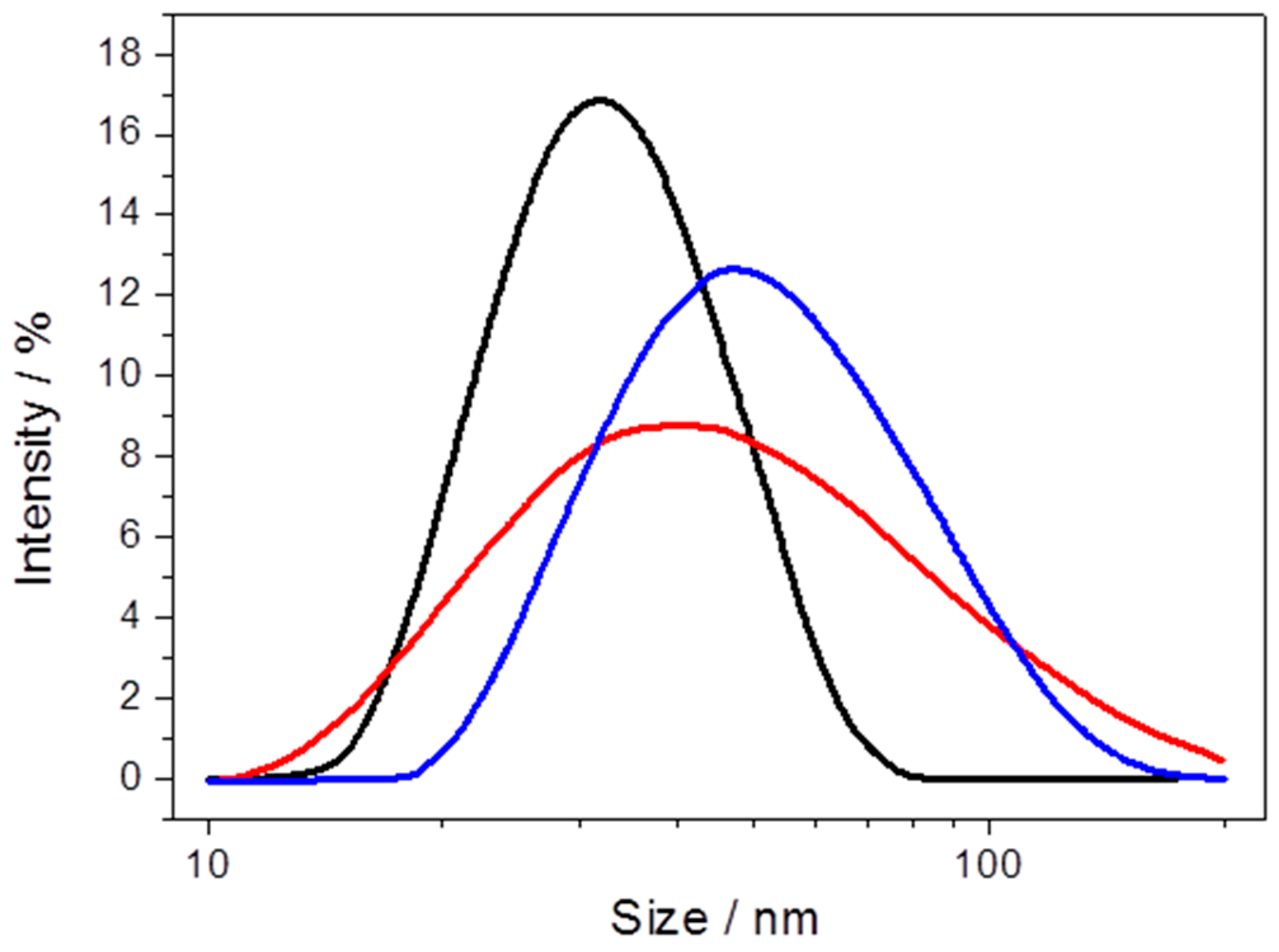 Particle size of PLBs, measured by dynamic light scattering of Ni-NTA-functionalized nanoparticles (NPs) (black), after CcO binding (red) and after dialysis (blue). Reproduced with permission of Schadauer et al. (2015) [40].