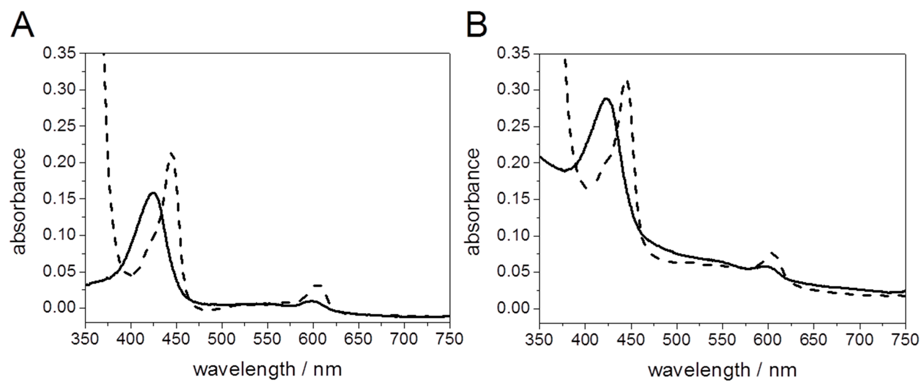 UV/Vis spectra of solubilized CcO (A) and PLB-bound CcO (B) oxidized with potassium ferricyanide (solid line) and reduced with sodium hydrosulfite (dashed line), respectively, at a CcO concentration of 1.1 µM. Reproduced with permission of Schadauer et al. (2015) [40].