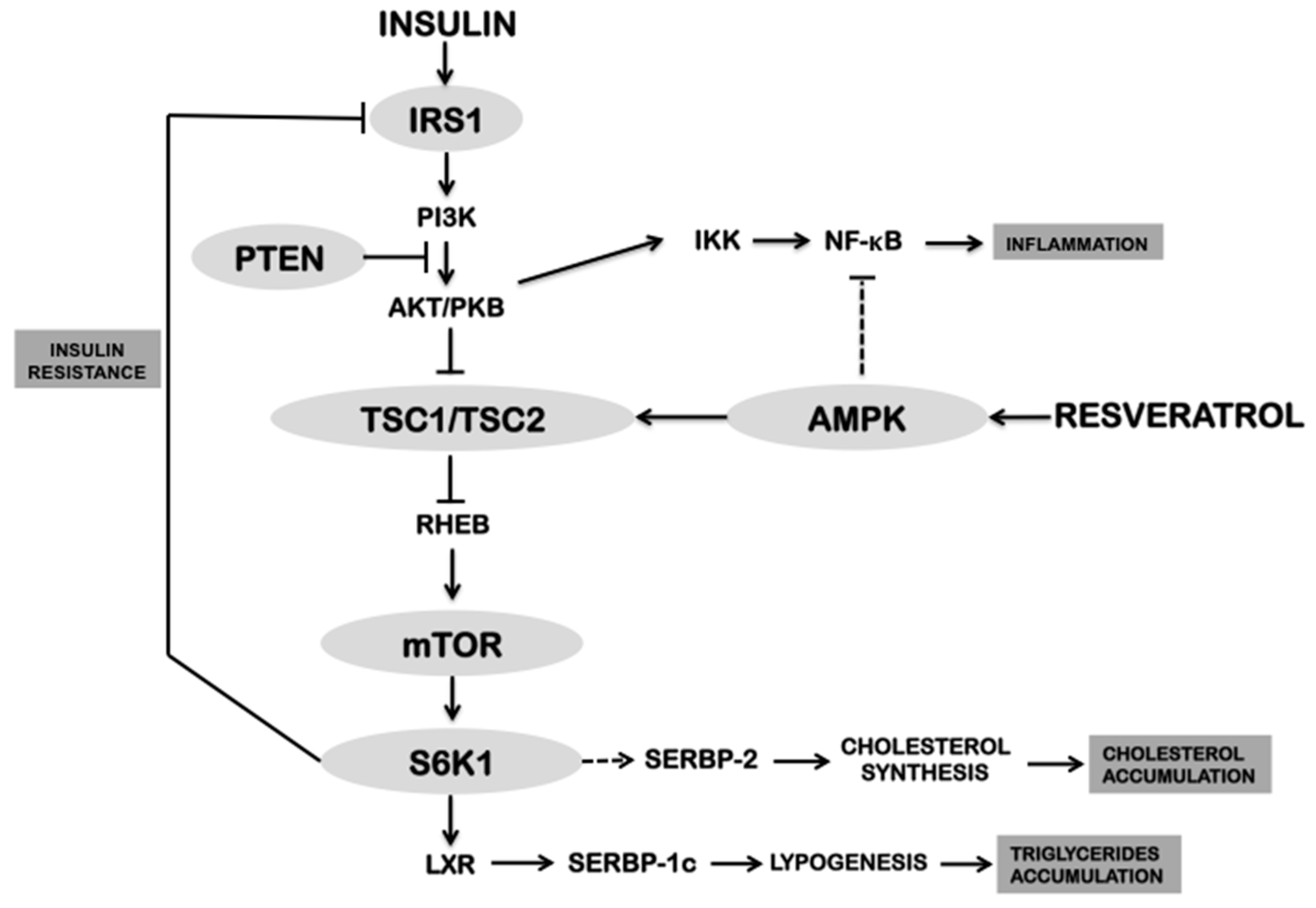 The IRS1/PI3K/AKT signaling pathway is considered a promoter of triglyceride accumulation in liver, due to its involvement on S6K1-mediated lipid metabolism. S6K1 can up-regulate by phosphorylation the transcription factor liver X receptor (LXR), a member of the nuclear receptors family [59]. Activation of LXR promotes transcription of the gene coding for sterol regulatory elements binding protein-1c (SREBP-1c), which is a transcription factor involved in the regulation of lipogenic enzymes such as acetyl-CoA carboxylase 1 and 2 (ACC) and fatty acid synthase (FAS) [59]. On the other hand, the inhibition of mTOR by rapamycin reduces the expression of lipogenic genes (SREBP-1c/2, ACC, FAS and esterearoil CoA desaturase 1 (SCD1)) [60,61,62]. Conversely, rat embryo cells with genotype TSC1−/− and TSC2−/− (corresponding to genes coding for TSC1/2 proteins) showed constitutive activation of mTOR and enhanced expression of lipogenic genes [62]. Together, this data indicates that hyperactivation of the IRS1/PI3K/AKT signaling pathway may promote mTOR activation, insulin resistance and hepatic triglyceride accumulation.