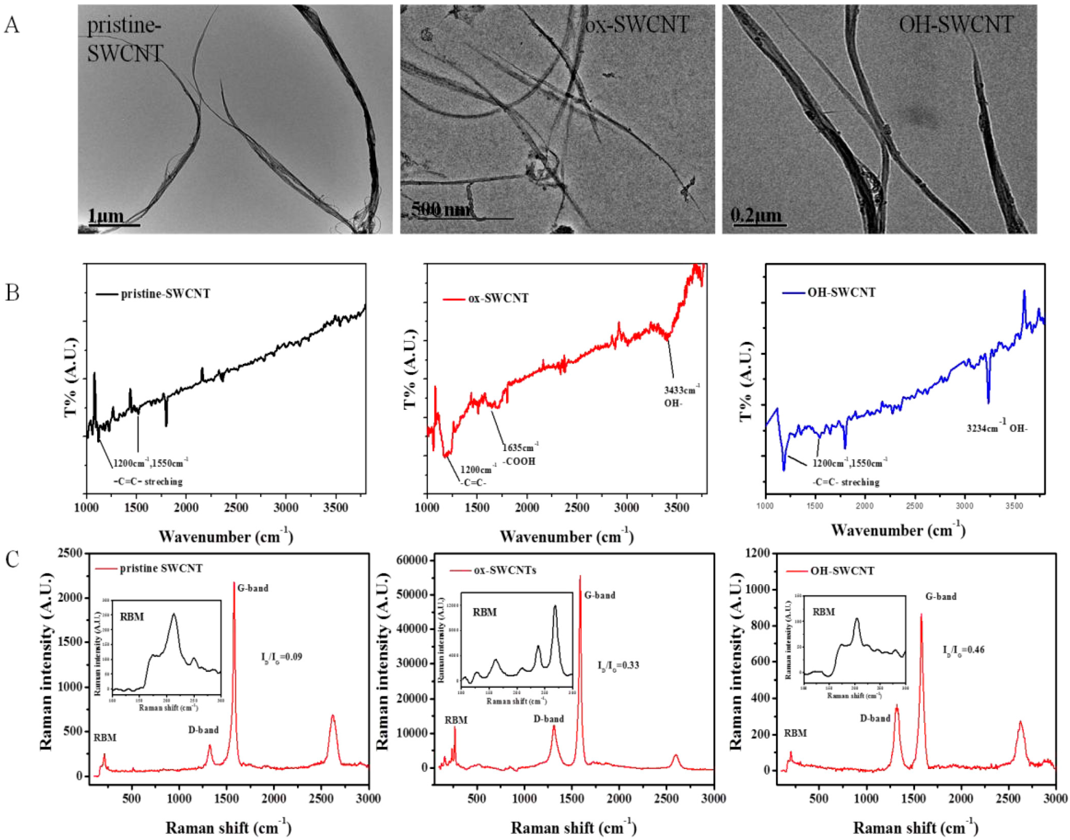 Characterization of three types of SWCNTs: (A) TEM images of (from left to right) pristine-SWCNTs, ox-SWCNTs, and OH-SWCNTs; (B) FT-IR spectra of (from left to right) pristine-SWCNTs, ox-SWCNTs, and OH-SWCNTs, showing the presence of –C=C– stretching (υ = 1200 and 1550 cm−1), –COOH (υ = 1635 cm−1) and –OH (υ = 3200–3600 cm−1) [46,47,48]; (C) Raman spectra of (from left to right) pristine-SWCNTs, ox-SWCNTs, and OH-SWCNTs. G-band and D-band were indicated. ID/IG ratios were shown as insets.