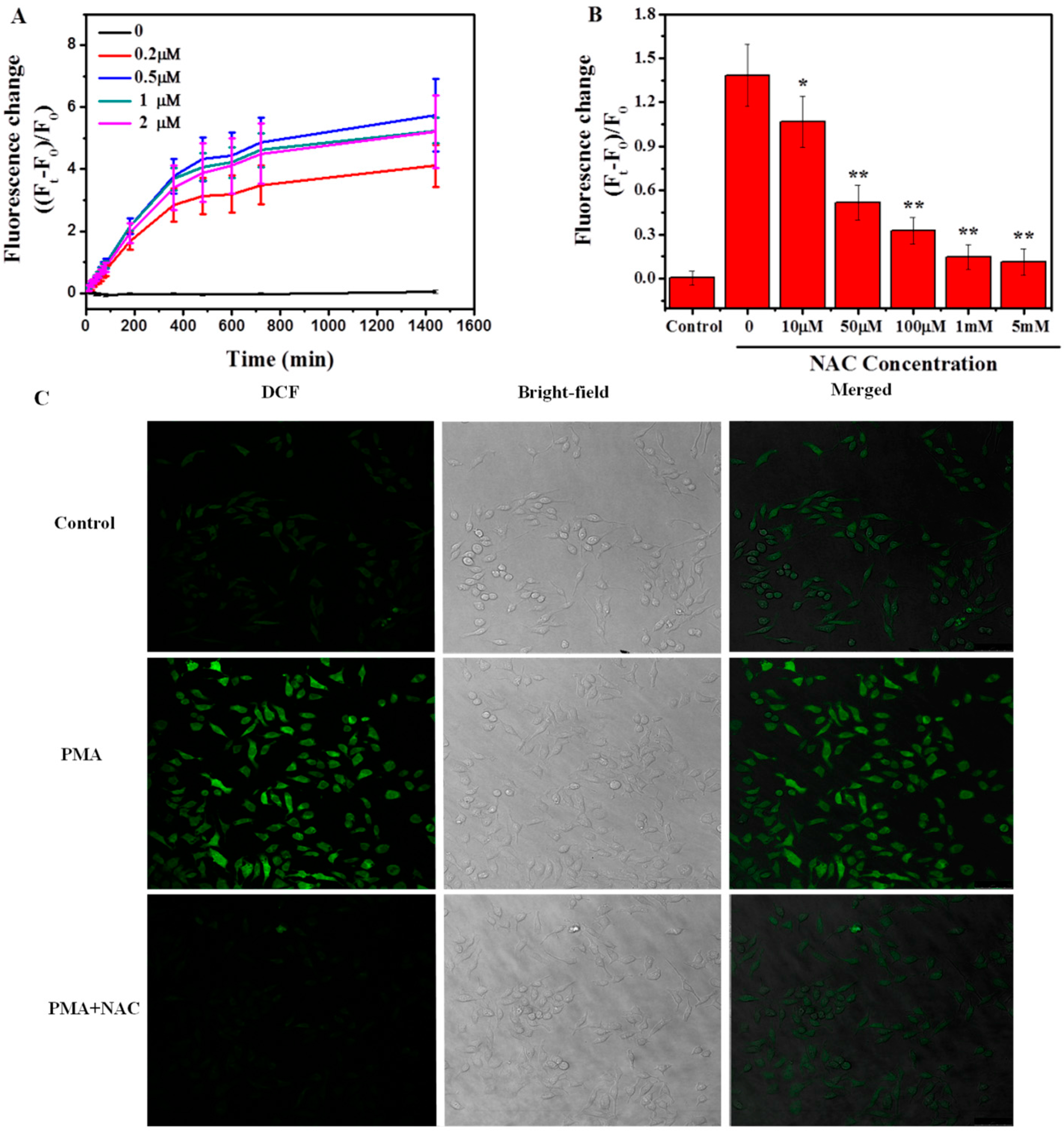 Induction and inhibition of respiratory burst in macrophages by PMA and NAC, respectively, evaluated through the generation of ROS. (A) Fluorescence intensity change of DCF over time in macrophages under the treatment of 0–2 μM PMA; (B) Fluorescence intensity change of DCF in macrophages with different concentrations of NAC pretreatment, followed by 0.5 μM PMA stimulation for 3 h (Ft); (C) Representative confocal images of macrophages treated in (B) with PMA concentration 0.5 μM, and NAC 1 mM. Green fluorescence represents DCF signal. The control group was cells without any treatment. Scale bar = 50 μM. (* p < 0.05; ** p < 0.01).