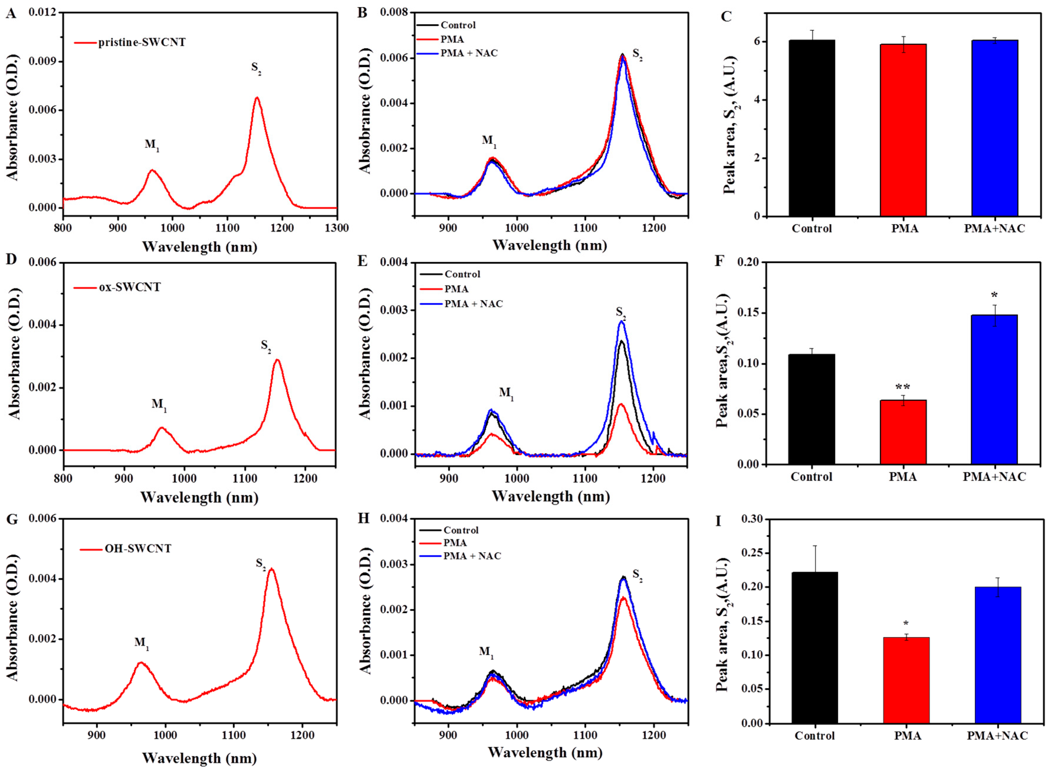 Biodegradation of SWCNTs in macrophages for 24 h with or without PMA activation, as evaluated by the infrared (NIR) spectra, normalized against baseline. (A,D,G) Typical UV-vis-NIR spectra of p-SWCNTs, ox-SWCNTs and OH-SWCNTs, respectively; (B,E,H) Influence of PMA and NAC treatment on the absorbance of M1 and S2 bands of p-SWCNTs, ox-SWCNTs and OH-SWCNTs in macropahges, respectively. Black line: control macrophages (untreated); Red line: PMA-activated macrophages; Blue line: PMA-activated macrophages with NAC pretreatment; (C,F,I) Quantification of the peak area of characteristic semiconducting transition band (S2) of (C) p-SWCNTs; (F) ox-SWCNTs; and (I) OH-SWCNTs in macrophages. Results were from at least three independent experiments and expressed as mean ± S.D. (* p < 0.05; ** p < 0.01).