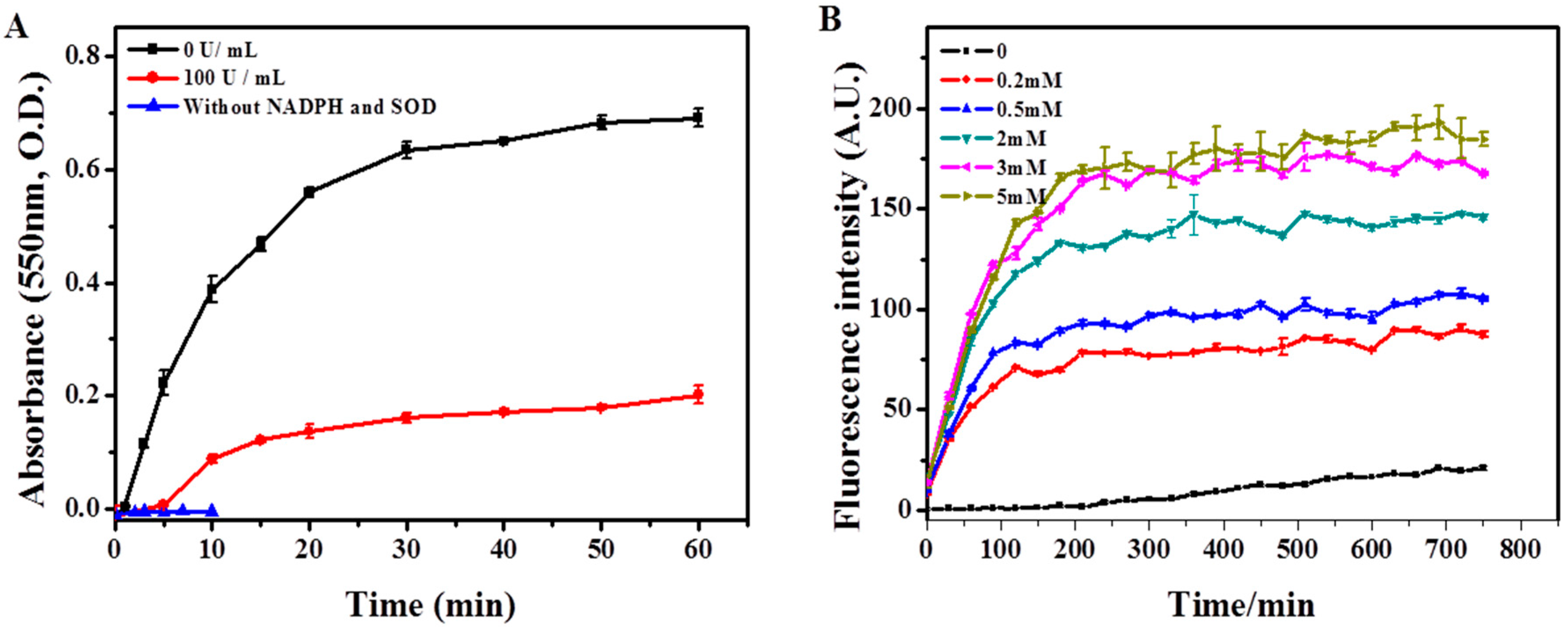 Construction of the in vitro respiratory burst enzymatic system, as evaluated through the generation of O2*− and H2O2. (A) The generation of O2*− by NOX solution over time in the presence or absence of SOD, as measured by ferrocytochrome c absorbance at 550 nm; (B) The production of H2O2 over time by NOX and SOD catalyses, in the presence of different concentrations (0–5 mM) of NADPH, as measured by the fluorimetric hydrogen peroxide assay.The data demonstrated that NOX was viable to produce O2*−, which was then converted to H2O2 by SOD.