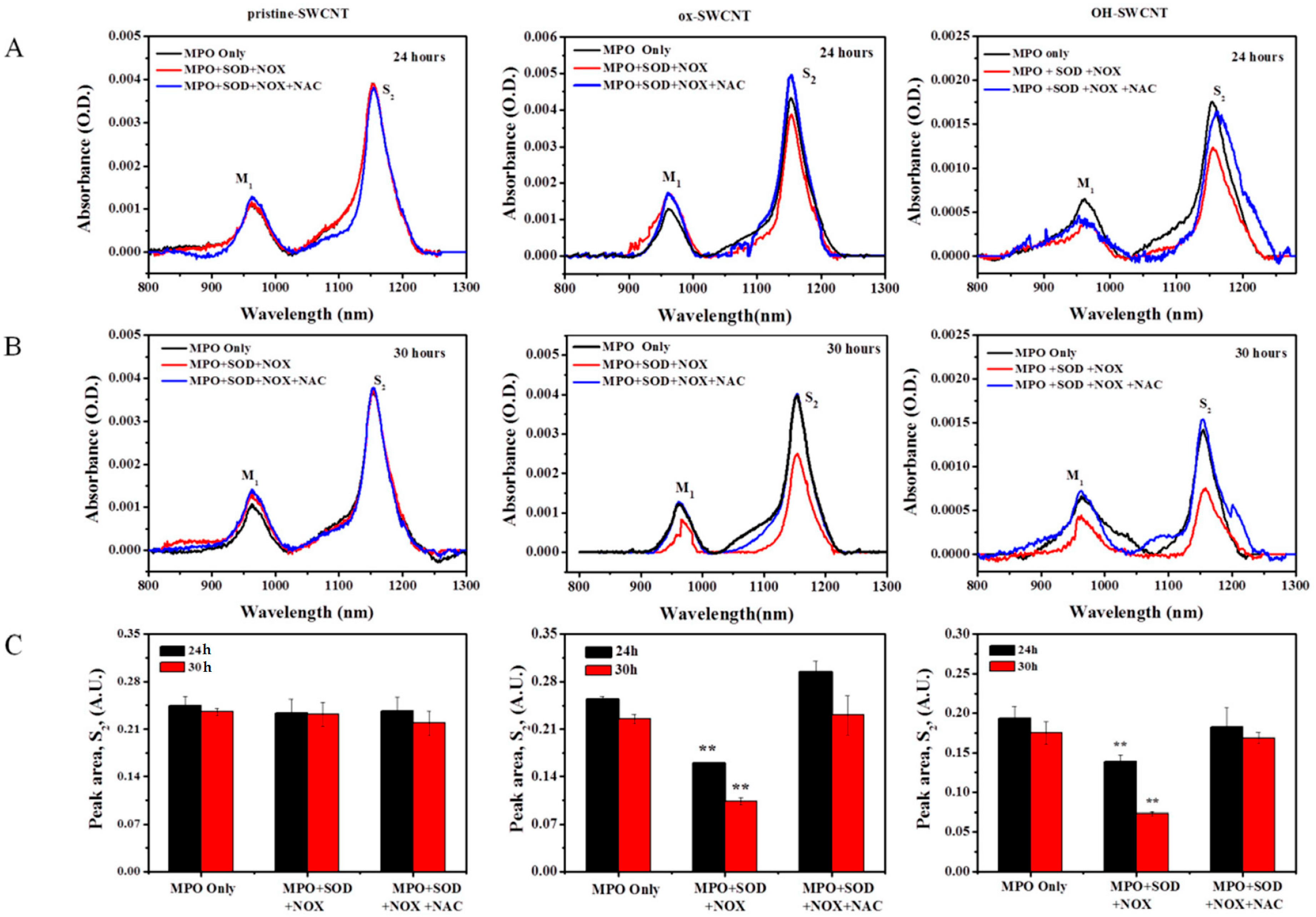 Degradation of SWCNTs by in vitro respiratory burst enzymatic system, as measured by UV-vis-NIR, normalized against baseline. Column from left to right: pristine-SWCNTs, ox-SWCNTs and OH-SWCNTs. The UV-vis-NIR spectra of SWCNTs incubated for 24 h (A) and 30 h (B) with different solutions were shown; (C) The peak area of S2 spectra of SWCNT. The reduced intensity of the S2 absorbance spectra indicating the degradation of SWCNTs. Results were from at least three samples and expressed as mean ± S.D. Significance of differences by comparing with the MPO only group was indicated with asterisks (** p < 0.01).