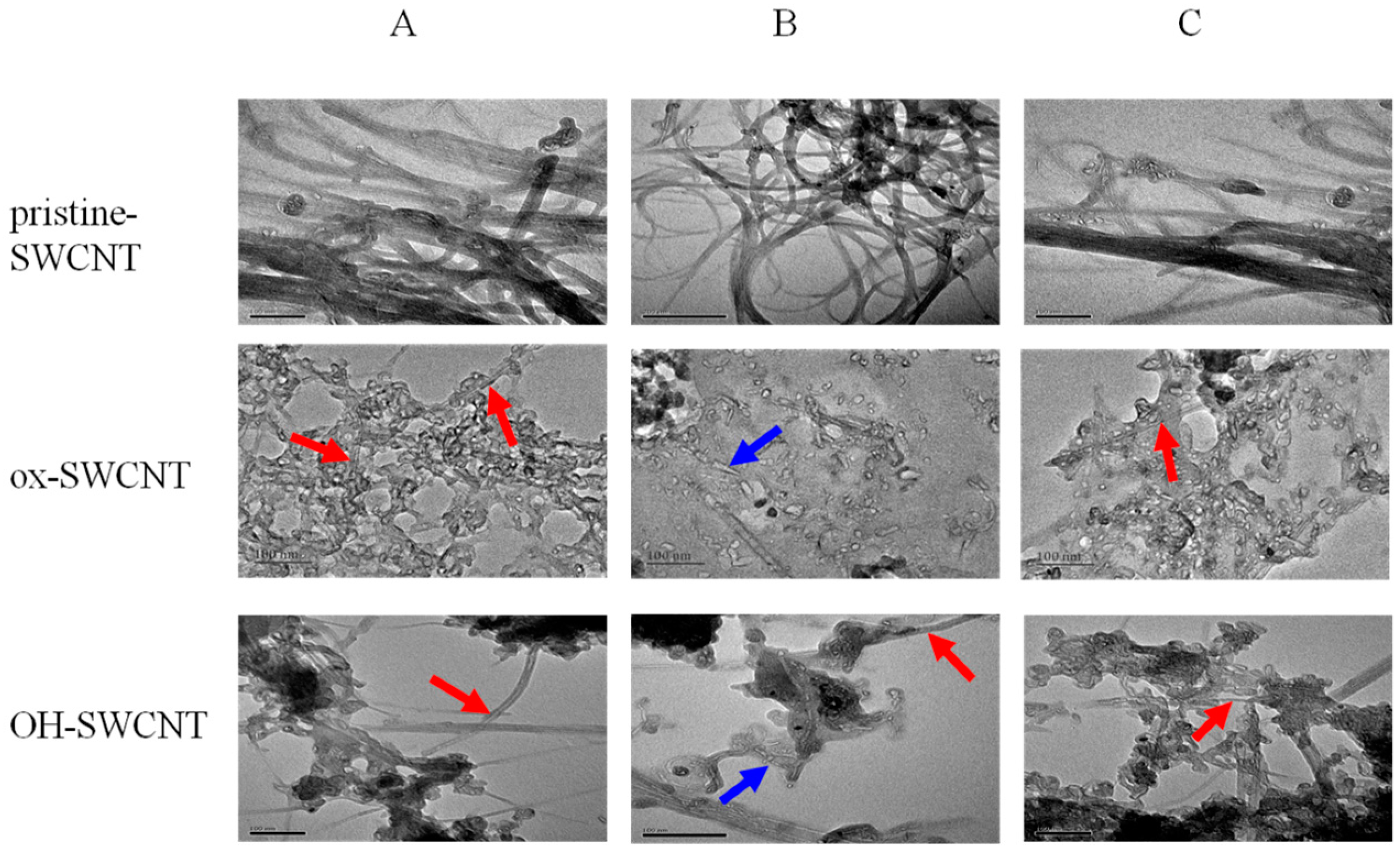 TEM imaging of SWCNTs (pristine-SWCNT, ox-SWCNT, OH-SWCNT) after 24 h incubation with in vitro respiratory burst enzymatic system. (A) MPO only; (B) Full enzyme solution (MPO + SOD + NOX); (C) Full enzyme solution supplemented with 1 mM NAC. Red arrows point to SWCNTs with long fiber-like shape; Blue arrows point to degraded fragments of SWCNTs. Scale bar = 100 nm.