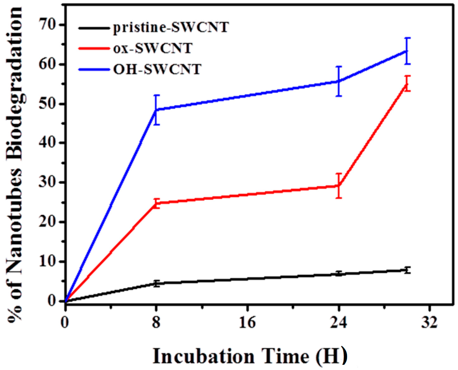 Previous studies showed a close relationship between the surface chemistry and the biodegradation of CNTs, and it seems that carboxylation on CNT surface is a prerequisite for CNT degradation [35]. The possible reason is because the carboxylation on CNTs might break the π-π interactions of CNTs and create two reactive sites that are potential sites for oxidative attack [64]. In this study, we compared three types of SWCNTs with different surface modifications, including p-SWCNTs, ox-SWCNTs, and OH-SWCNTs. The infrared spectra assessments revealed about 51% of OH-SWCNTs and 25% of ox-SWCNTs were degraded after 8 h incubation with an in vitro enzymatic system. After 30 h incubation, 63% of OH-SWCNTs and 53% of ox-SWCNTs were degraded. During the whole incubation, only negligible degradation (<5%) of pristine SWCNTs was observed (Figure 9). This suggests that except for p-SWCNTs carrying negligible defect sites, both ox-SWCNTs and OH-SWCNTs underwent serious structural damage and OH-SWCNTs were more susceptible to the oxidative attack than ox-SWCNTs. During the preparation of ox-SWCNTs, the acid oxidation of SWCNTs introduced both carboxyl and hydroxyl groups on the surface of SWCNTs, while OH-SWCNTs possess hydroxyl groups only (Figure 1B). It is difficult to differentiate the contribution of the carboxyl and hydroxyl groups to the biodegradation of SWCNTs. However, our results at least illustrated that oxygen-functionalized SWCNTs were biodegradable. Alternatively, the higher biodegradation of OH-SWCNTs may result from the fact that OH-SWCNTs originally possess higher level of defect sites than ox-SWCNTs do (Figure 1C), and thus provide more points for oxidative attack.