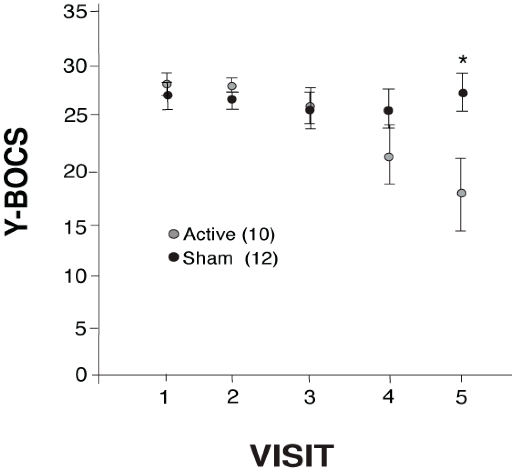 Yale-Brown Obsessive Compulsive Scale (Y-BOCS) mean scores (±SE) from baseline (Visit 1) to the end of repetitive transcranial magnetic stimulation (rTMS) treatment (Visit 5) with a significant difference (*) at Visit 5; * p < 0.05. Hedge’s g at Visit 5: 1.001.