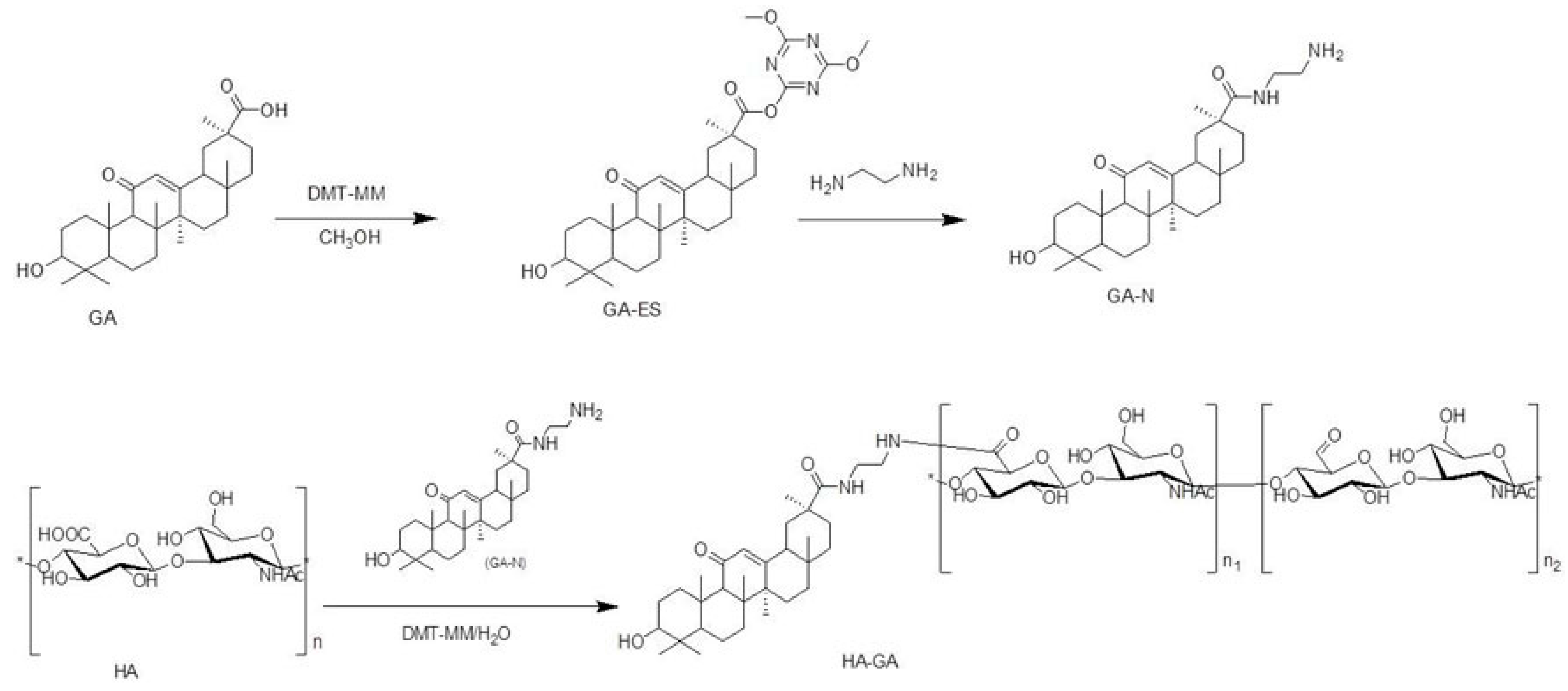 Synthetic route of hyaluronic acid-glycyrrhetinic acid (HA–GA) conjugate via 4-(4,6-dimethoxy-1,3,5-triazin-2-yl)-4-methylmorpholinium chloride (DMT–MM)-mediated coupling reactions.