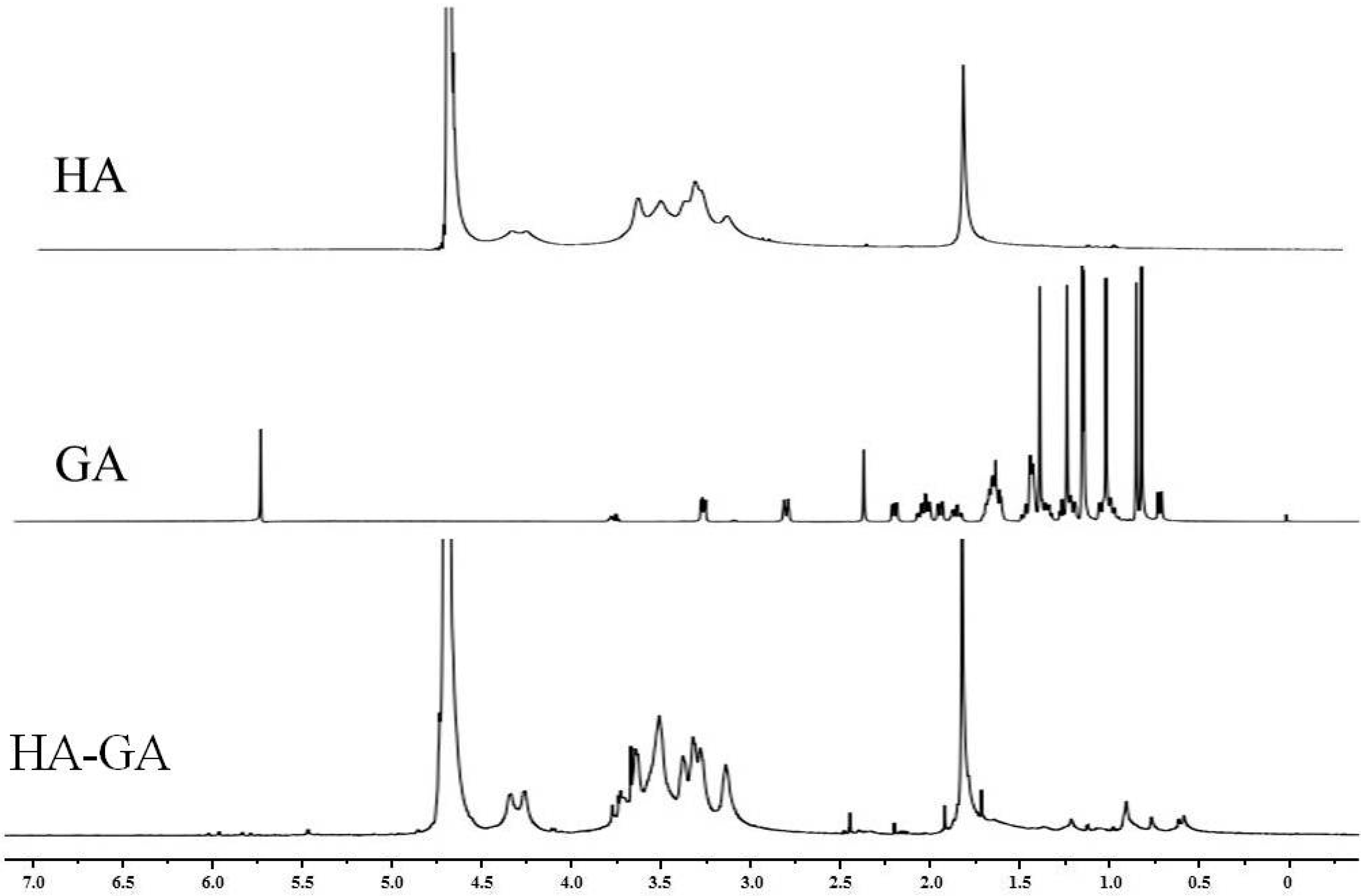 1H-NMR spectra of HA, GA, and the HA–GA conjugate.