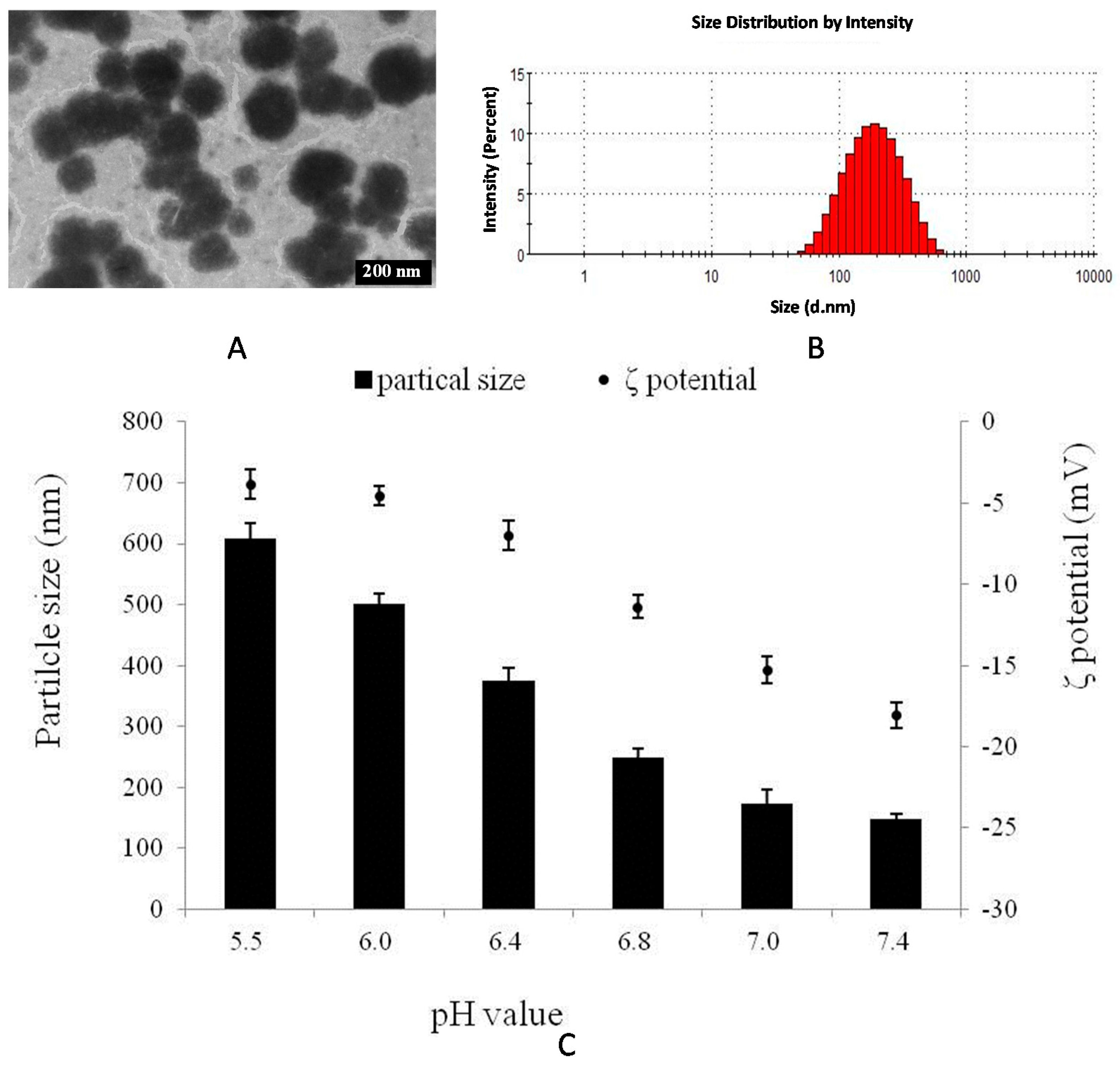 Characterization of HA–GA/HA–His mixed micelles. (A) TEM image of mixed micelles; (B) Particle size distribution of mixed micelles; (C) Particle size and ζ potential of mixed micelles at external pH 7.4–5.5.
