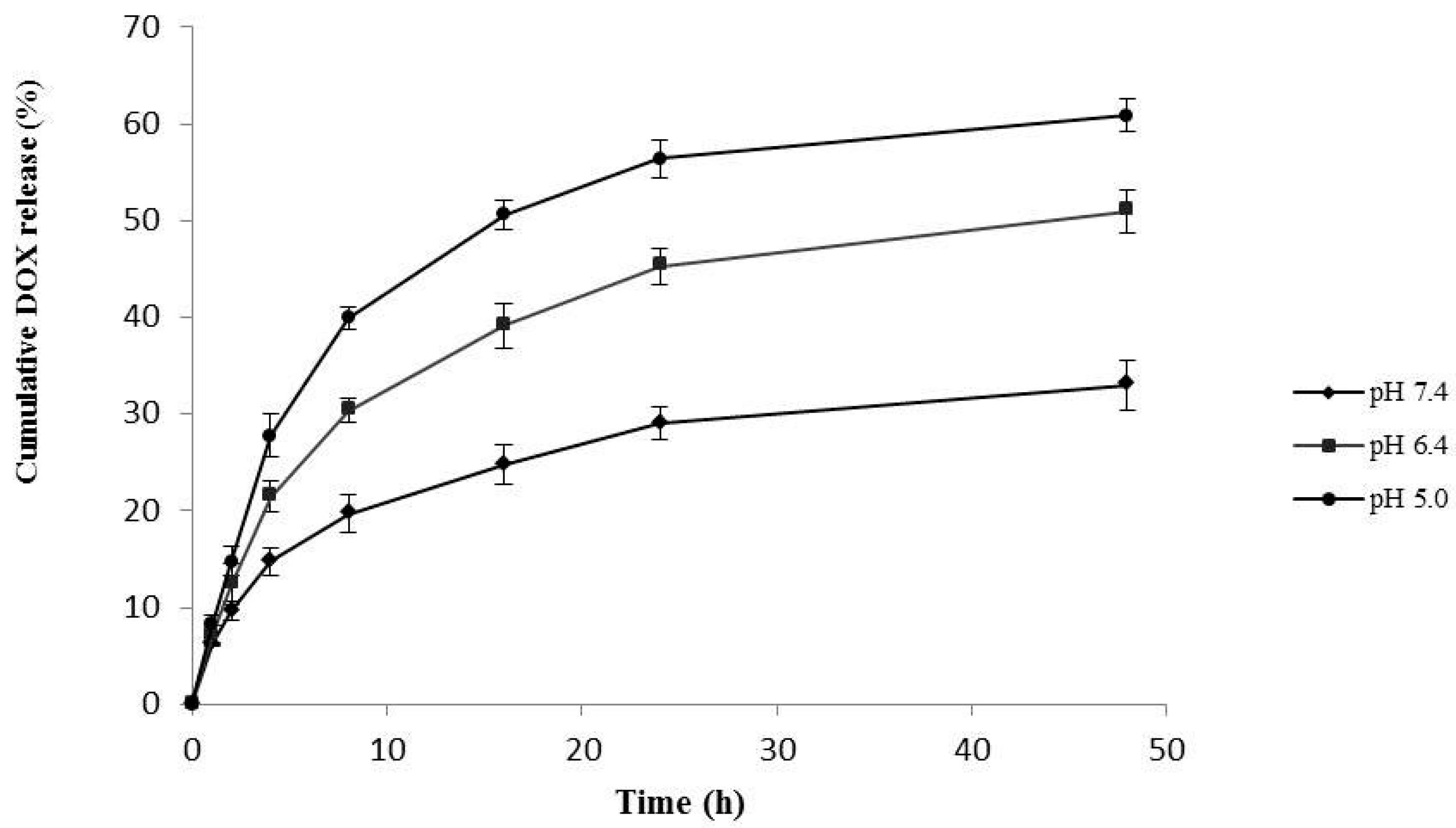 The in vitro drug release behavior of the HA–GA/HA–His micelles was investigated under physiological conditions (pH 7.4), tumor acidic microenvironment (pH 6.4), and intralysosomal pH (pH 5.5) at 37 °C. As shown in Figure 5, the DOX release was significantly influenced by pH. Within 5 h, 14.6 wt % of DOX was released from the micelles at pH 7.4, whereas 21.4 and 27.8 wt % were released at pH 6.4 and 5.5, respectively. Within 48 h, 37.9 wt % of DOX was released from the micelles at pH 7.4, whereas 49.5 and 67.9 wt % were released at pH 6.4. The results suggest that the DOX-loaded HA–GA/HA–His micelles exhibited a sustained DOX release under physiological conditions and a faster release under tumor microenvironment and lysosomal pH in tumor cells.