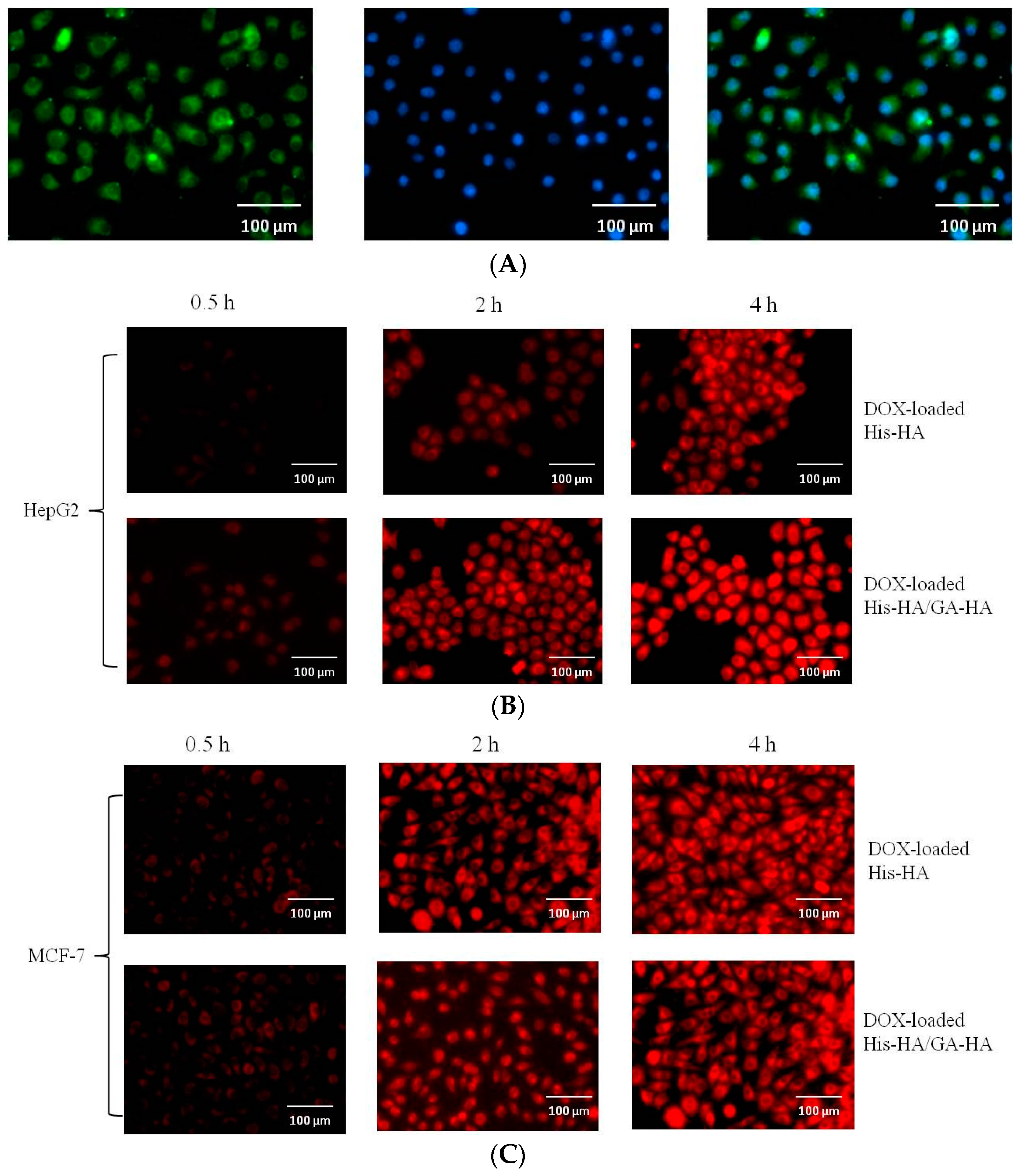 The presence of GA in HA–GA/HA–His micelles is essential for hepatoma-targeting drug delivery. The intracellular uptake of the DOX-loaded HA–GA/HA–His micelles was investigated using fluorescence microscopy (Figure 7B,C). DOX-loaded micelles were incubated with liver carcinoma cells (HepG2) over-expressing GA-receptor or non-hepatic tumor cells (MCF-7) for 0.5, 2 and 4 h. DOX served as a fluorescence probe to track the DOX-loaded micelles. As shown in Figure 6B, cellular uptake of DOX increased with the extension of incubation time; however there were significant differences between the two DOX-loaded micelles against HepG2 cells. Red fluorescence spots were remarkably observed in the cytoplasm of HepG2 cells after incubation for 2 and 4 h. This finding suggests that the DOX-loaded HA–GA/HA–His micelles were readily taken up by HepG2 cells. By contrast, the red fluorescence of DOX was weak when DOX-loaded HA–His micelles were incubated with HepG2. This phenomenon may be attributed to the fact that GA receptor-mediated endocytosis promoted the cellular uptake of the DOX-loaded HA–GA/HA–His micelles. Moreover, when DOX-loaded micelles were incubated with MCF-7 cells, which did not over-express GA-receptor, no significant difference was observed between two treatments. These results suggest that the presence of GA in the mixed micelles might play a major role in hepatocyte-targeting activity [36,37].