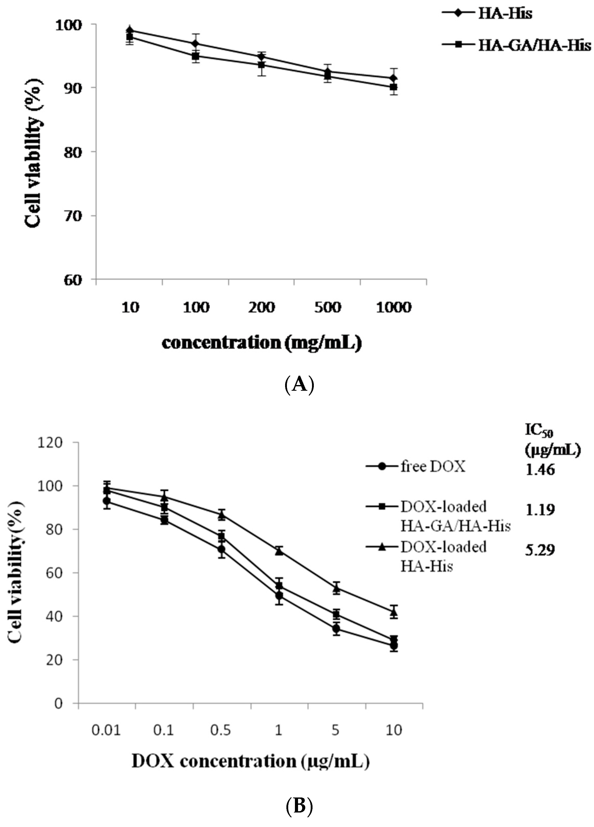 Viability of HepG2 cells after respective treatment with blank micelles (A) and free DOX, DOX-loaded HA–His micelles, or DOX-loaded HA–GA/HA–His micelles (B) for 48 h.