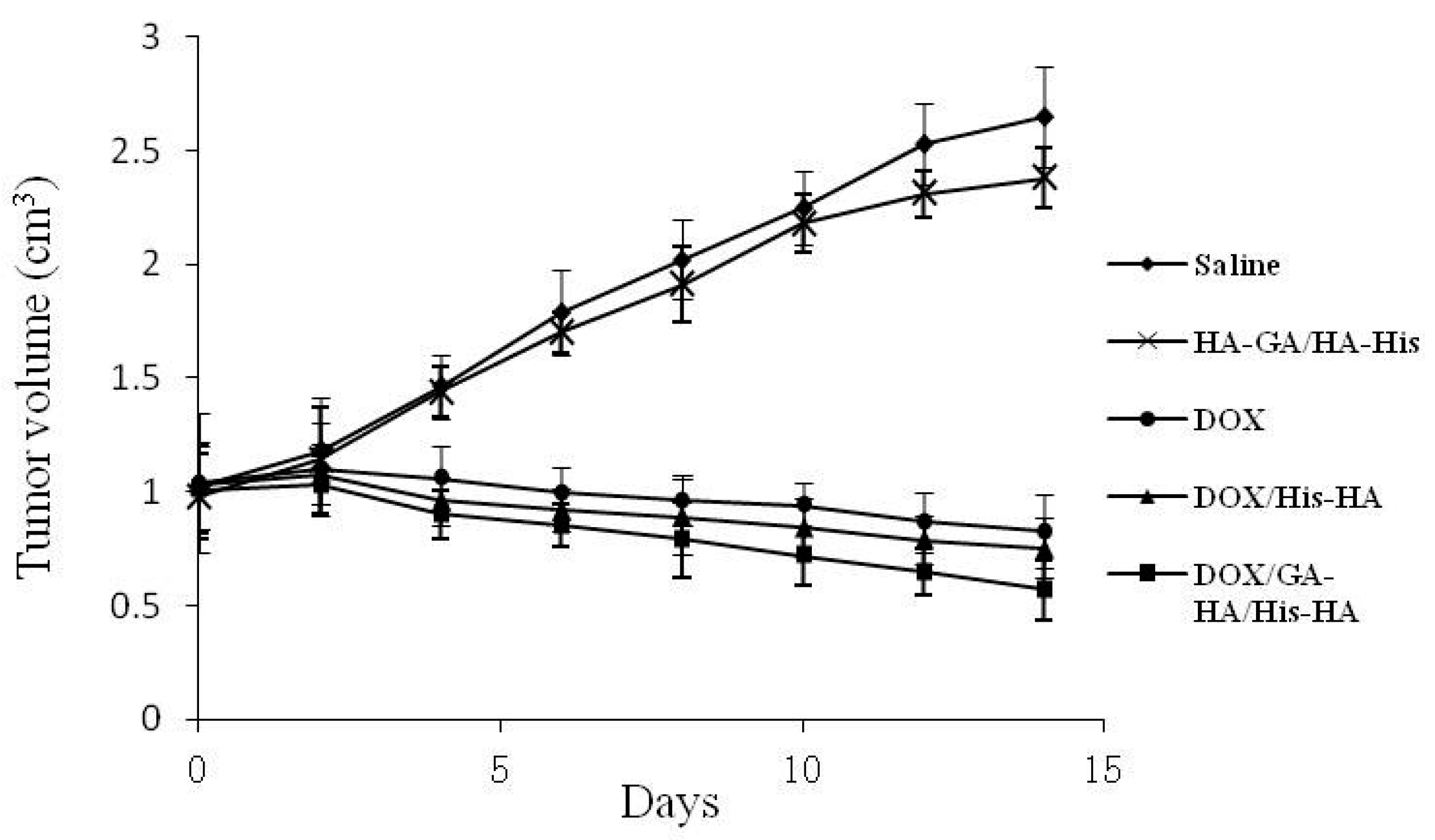 Inhibition of tumor growth by respective injection of physiological saline (control), blank HA–GA/HA–His micelles, free DOX·HCl, DOX-loaded HA–His micelles, or DOX-loaded HA–GA/HA–His micelles. The data represent the mean of the tumor volume from six mice ± SD.