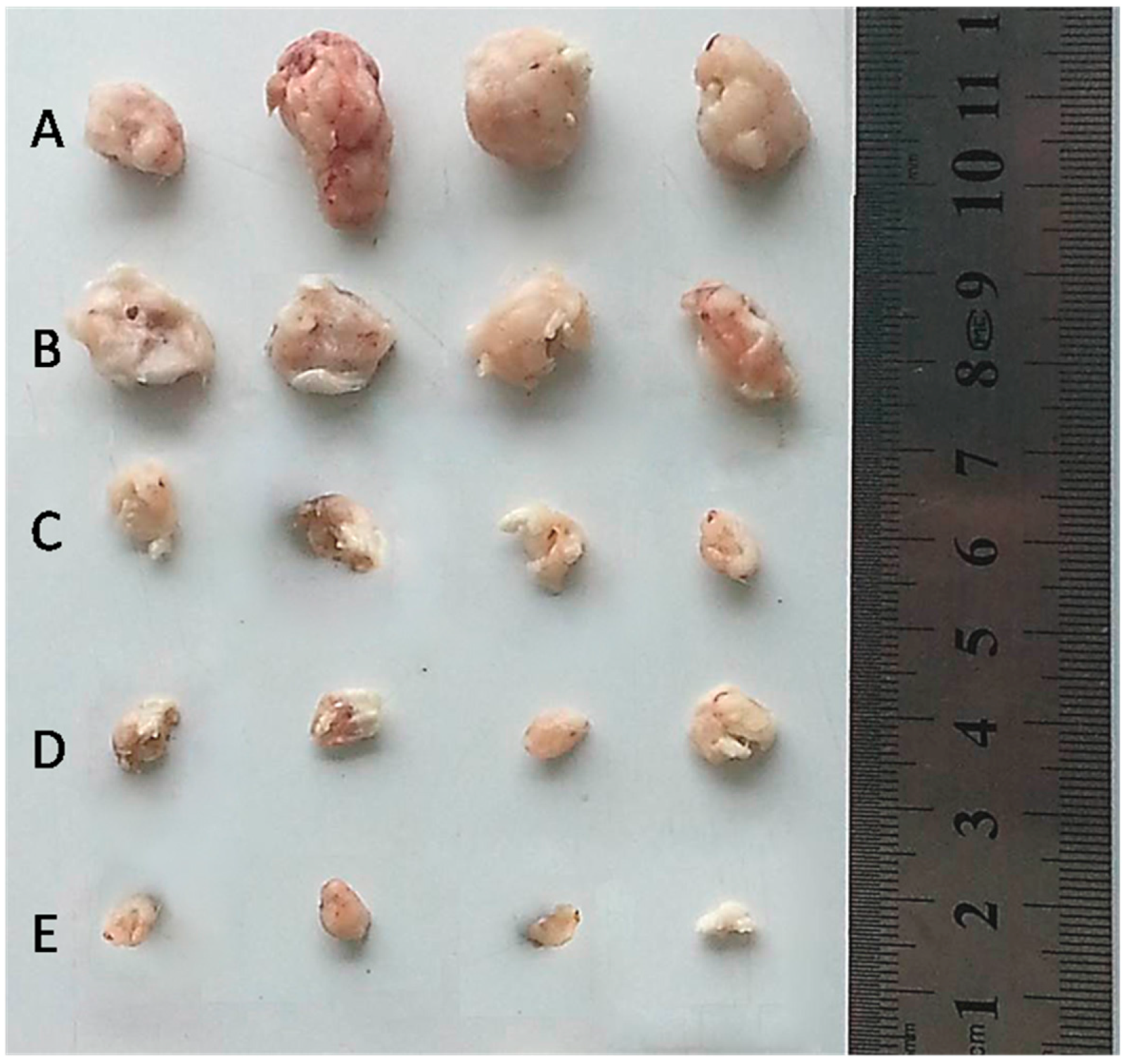 Tumors of each group treated with saline (A); black HA–GA/HA–His micelles (B); free DOX·HCl (C); DOX-loaded HA–His micelles (D); and DOX-loaded HA–GA/HA–His micelles (E) on the 14th day.
