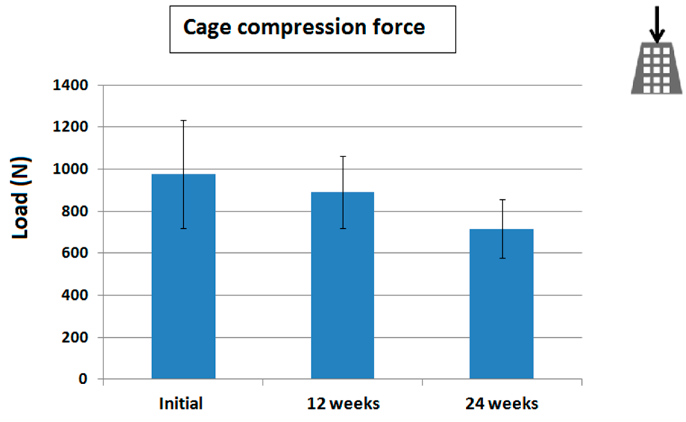 The three-dimensional (3D) printed cage degradation test. Compressive results showed averaged maximal compressive loads of 977, 889, and 715 N immediately after, at 12 and 24 weeks after immersion in phosphate buffer solution (PBS), respectively. These results evidenced the cage degradation. Photography on right upper corner represented the direction of the compression test.