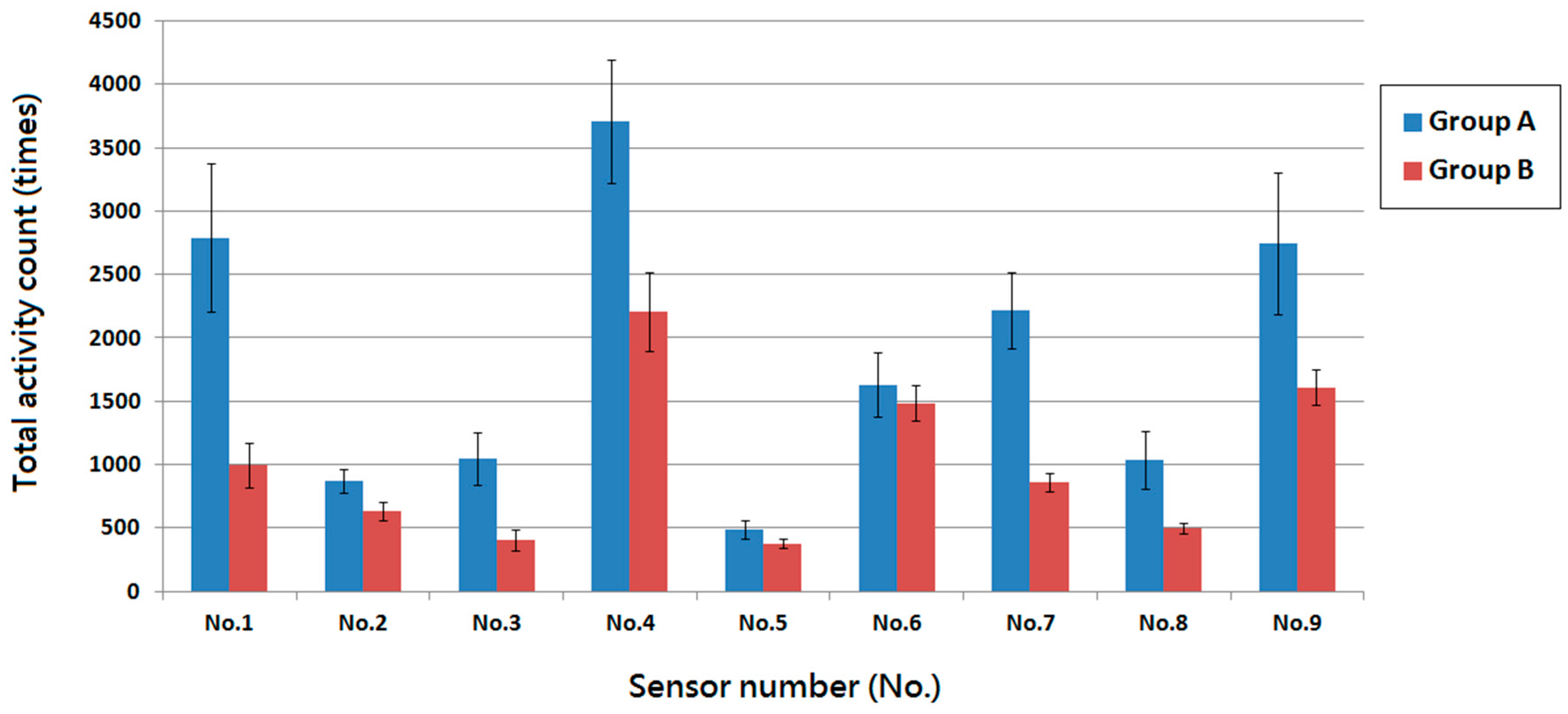 The postoperative one-week total activity counts of rabbits in the Animal behavior cage. Rabbits in group A showed higher total activity counts compared to that of rabbits in group B. Rabbits in both groups showed relatively higher numbers of triggers at sensor locations No. 4 and No. 6 which indicated more frequent visits to the food and water supply site. Rabbits in group A also demonstrated higher numbers of triggers at sensor locations No. 1, No. 7 and No. 9 but less at senor location No. 5, which represented rabbits were addicted to stay at the corners and avoided to stay in the center of the cage.