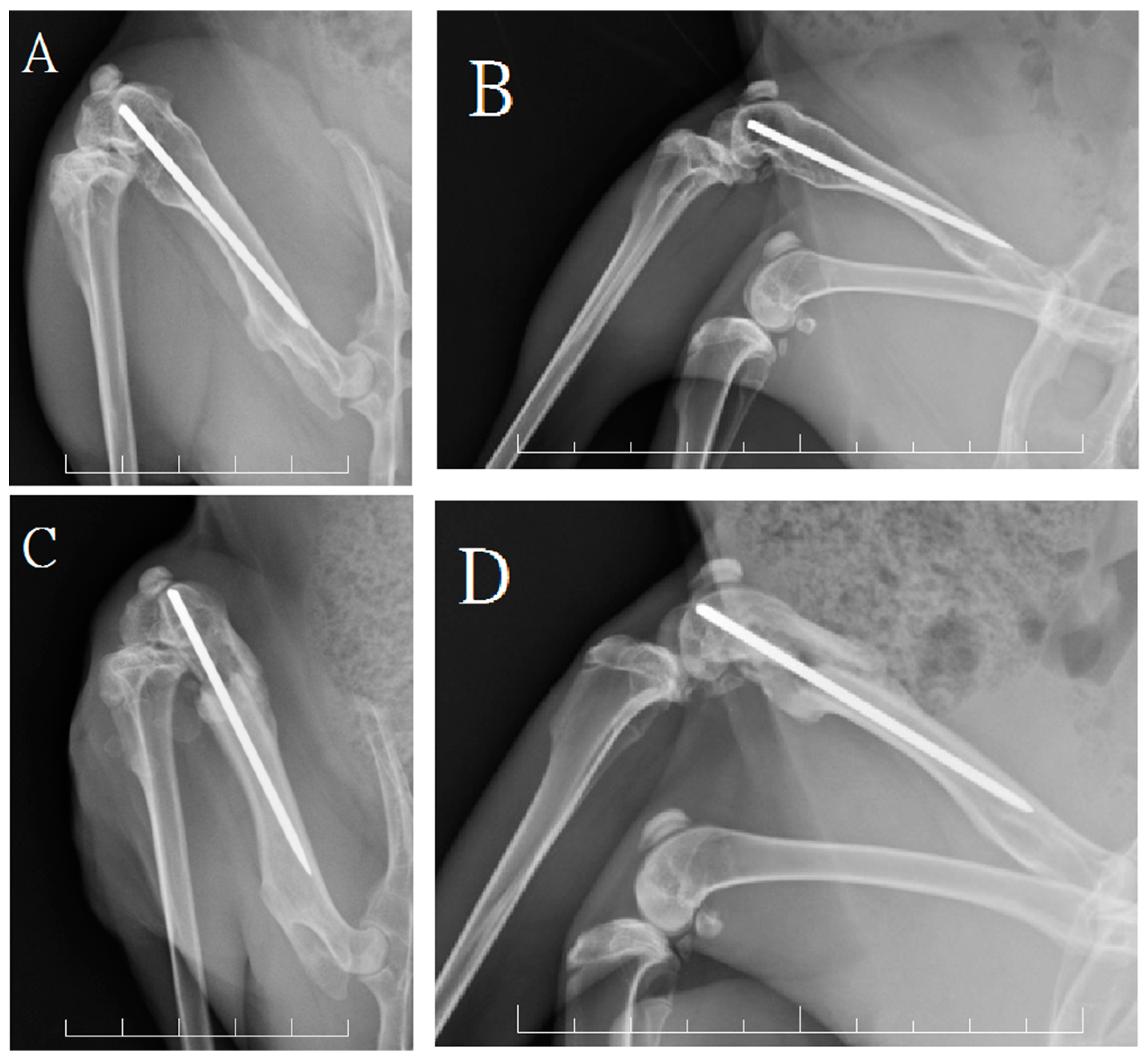 - Montijo, H.E.; Kellam, J.F.; Gettys, F.K.; Starman, J.S.; Nelson, M.K.; Bayoumi, E.M.; Bosse, M.J.; Gruber, H.E. Utilization of the AO LockingRatNail in a novel rat femur critical defect model. J. Investig. Surg. 2012, 25, 381–386. [Google Scholar] [CrossRef] [PubMed]