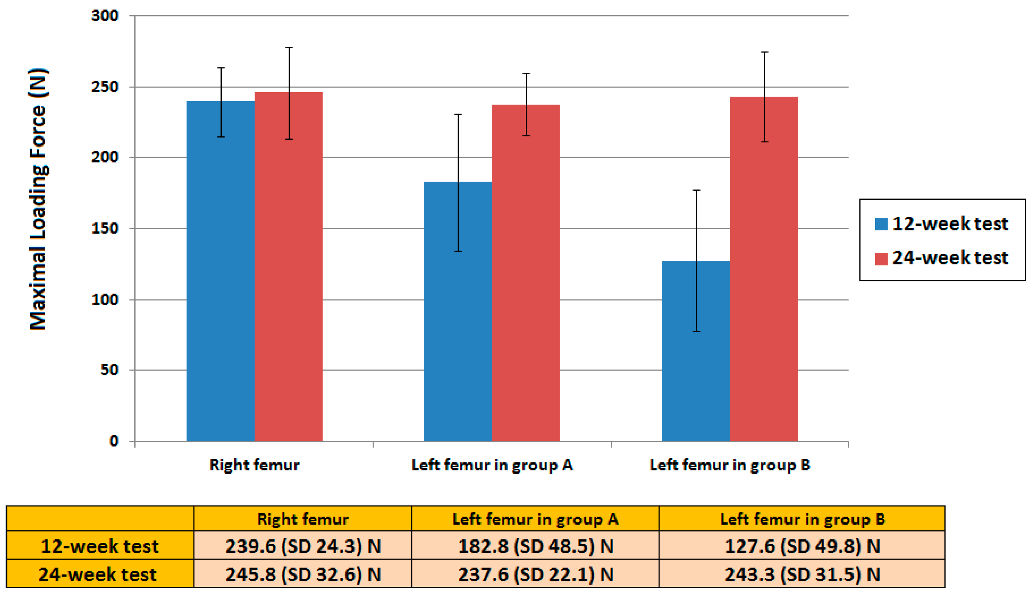 The 3-point bending strength test. The bending strength of the left femur in group A at the 12-week test revealed no statistic difference than that of the healthy leg. However, the strength of the left femur in group B was considerably smaller than that of the right healthy leg. In the 24-week test, the bending strengths of the left femur in both groups showed no significant difference than that of the right femur.