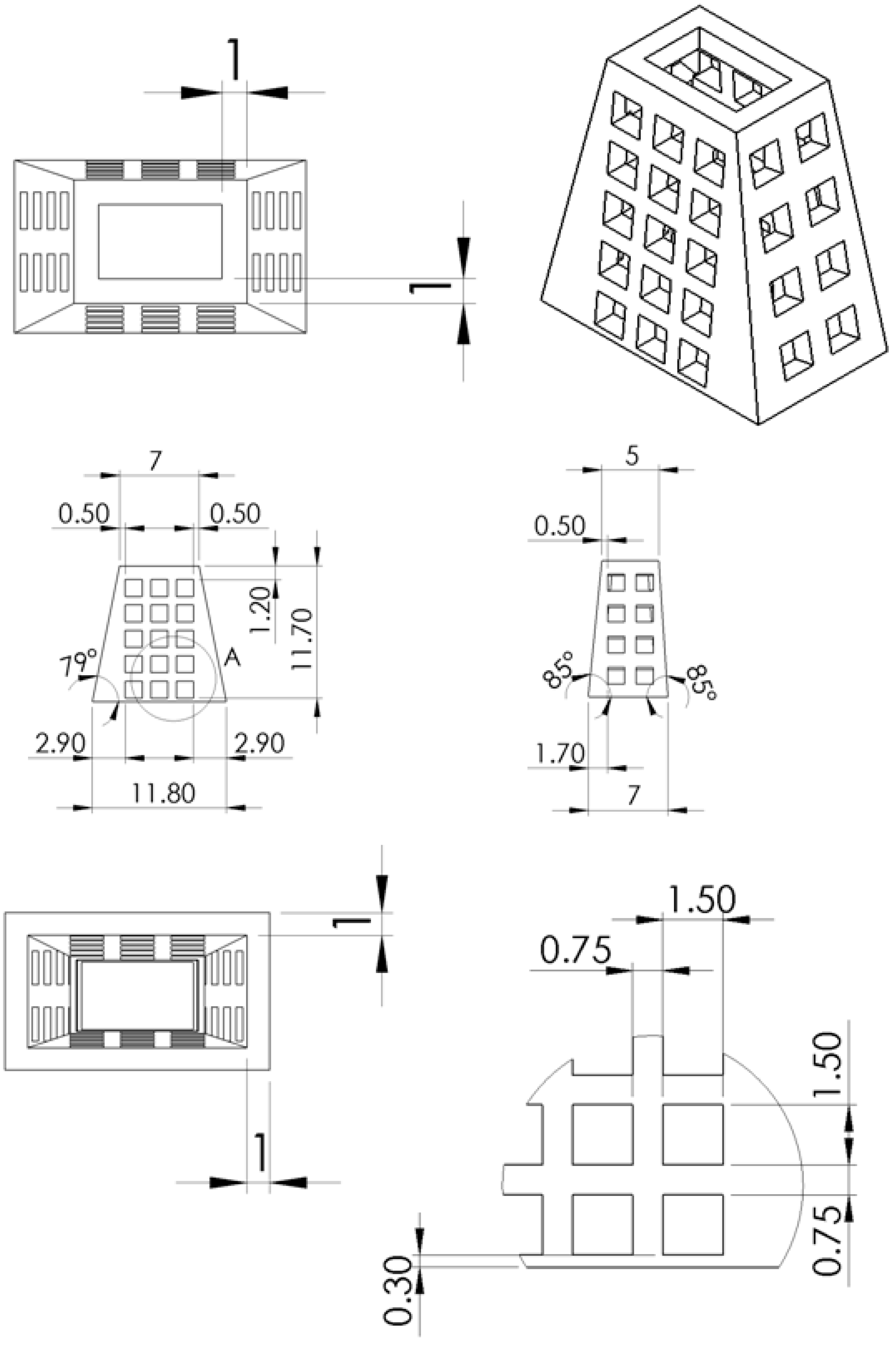 The design and dimension of the 3D printed truncated-pyramid cage.