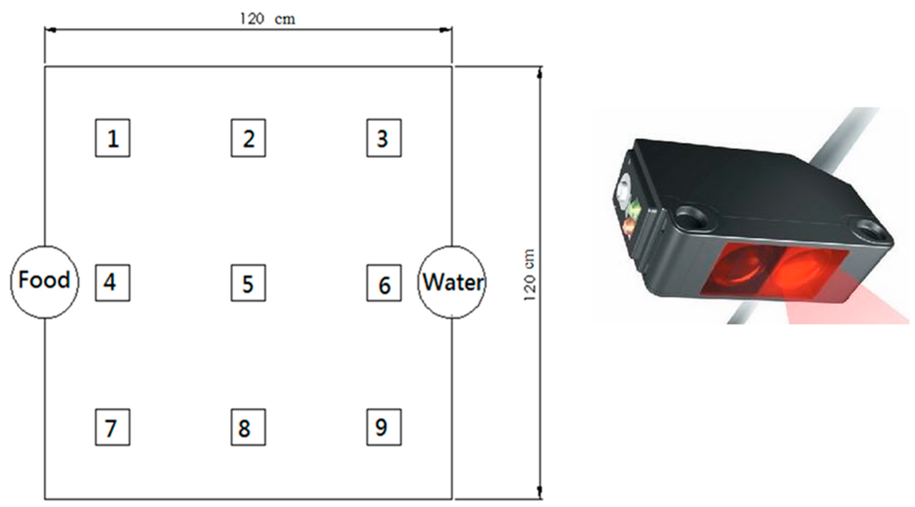 Following the surgical procedure, all rabbits were allowed to live freely, were given standard rabbit chow and sterilized drinking water ad libitum. The temperature and humidity of our institutional animal care center were maintained around 24 °C and 70%, respectively. The animals’ general activity was evaluated on a daily basis by housing the rabbit in a lab-made animal behavior cage (ABC) for one week, after which the rabbit was returned to its original individual cage for further animal care. As shown in Figure 11, the ABC cage (1.2 × 1.2 × 0.7 m) consisted of a generous floor and high walls. Nine diffusion-scan type photoelectric switch sensors, with a self-contained amplifier, (HP100-A1, Azbil Corp., Tokyo, Japan) were used to monitor the rabbit movement within the cage. The sensors were placed at the top of the cage, at a distance of 30 cm between one another. The sensors were clamped along the three bars separating the cage into nine symmetrical areas. (Figure 12) The sensors were adjusted to detect movement within a 250 × 250 mm volume of space around the base of the cage. As a rabbit moved from one area of the cage to another, the sensor in the “approaching” area would be triggered by the activity. The total number of triggers was recorded on a personal computer equipped with an acquisition interface. Each rabbit’s activity was monitored for one week.