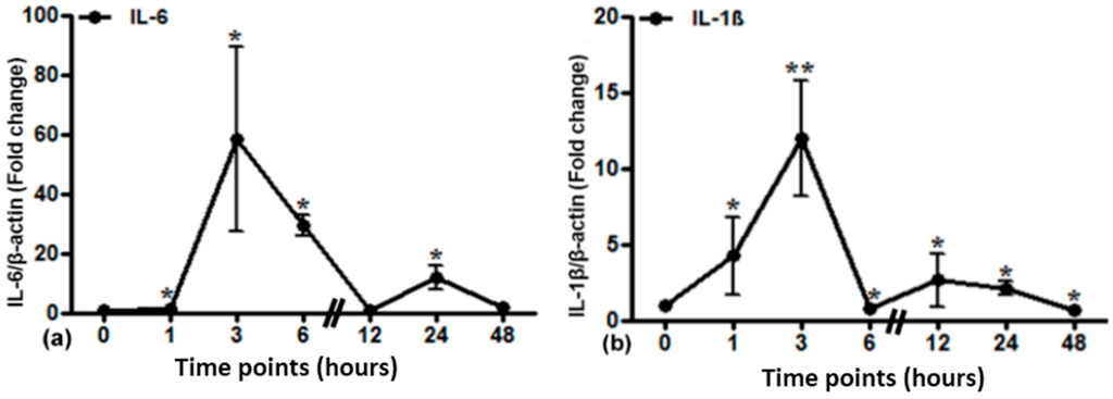 Fold change of mRNA expression of Lipocalin2 (LCN2) in irradiated lung tissue at time points from 1 to 48 h. Data are given relative to normal sham irradiated control rats (a). The results were normalized to the housekeeping gene β-actin, experimental errors are shown as ±SEM (* p ≤ 0.05, ** p ≤ 0.005, n = 3). Ct values are depicted in (b).