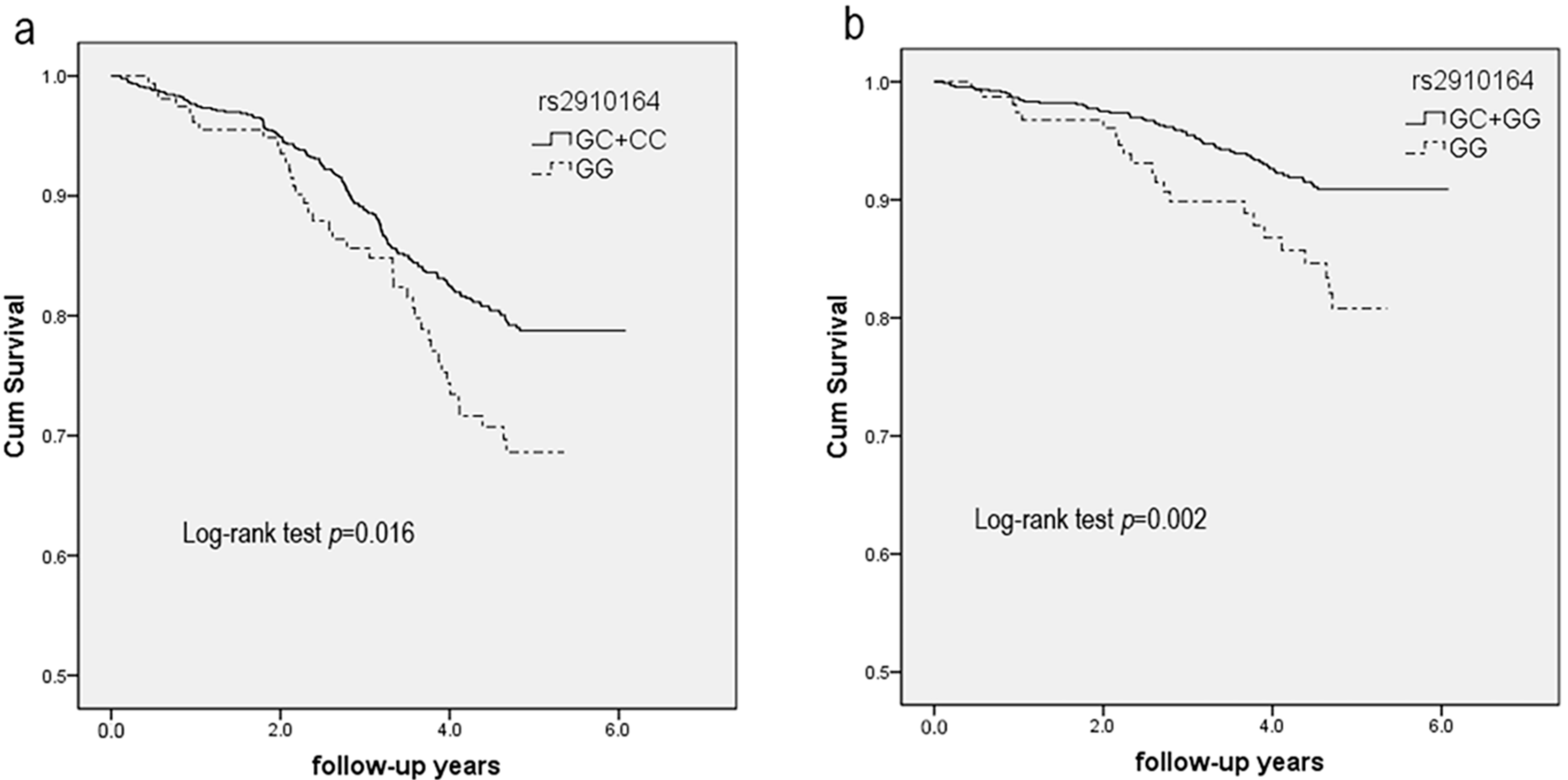 The χ2 test was performed to test genotype and allele frequencies, qualitative variables, and HWE. Multivariable logistic regression model was conducted to evaluate associations between rs2910164 and stroke incidence. In the prospective study, Kaplan–Meier survival analysis and Cox proportional hazards models were used to describe the association between rs2910164 and stroke recurrence and prognosis. The unadjusted hazard ration was shown in Model 1. In Model 2, age and sex were adjusted, and age, sex, hypertension, diabetes mellitus, smoking status, and alcohol intake were adjusted in Model 3. Two-tailed p < 0.05 was considered significant. Statistical analyses were carried out with SPSS software, version 13.0 (SPSS Inc., Chicago, IL, USA).
