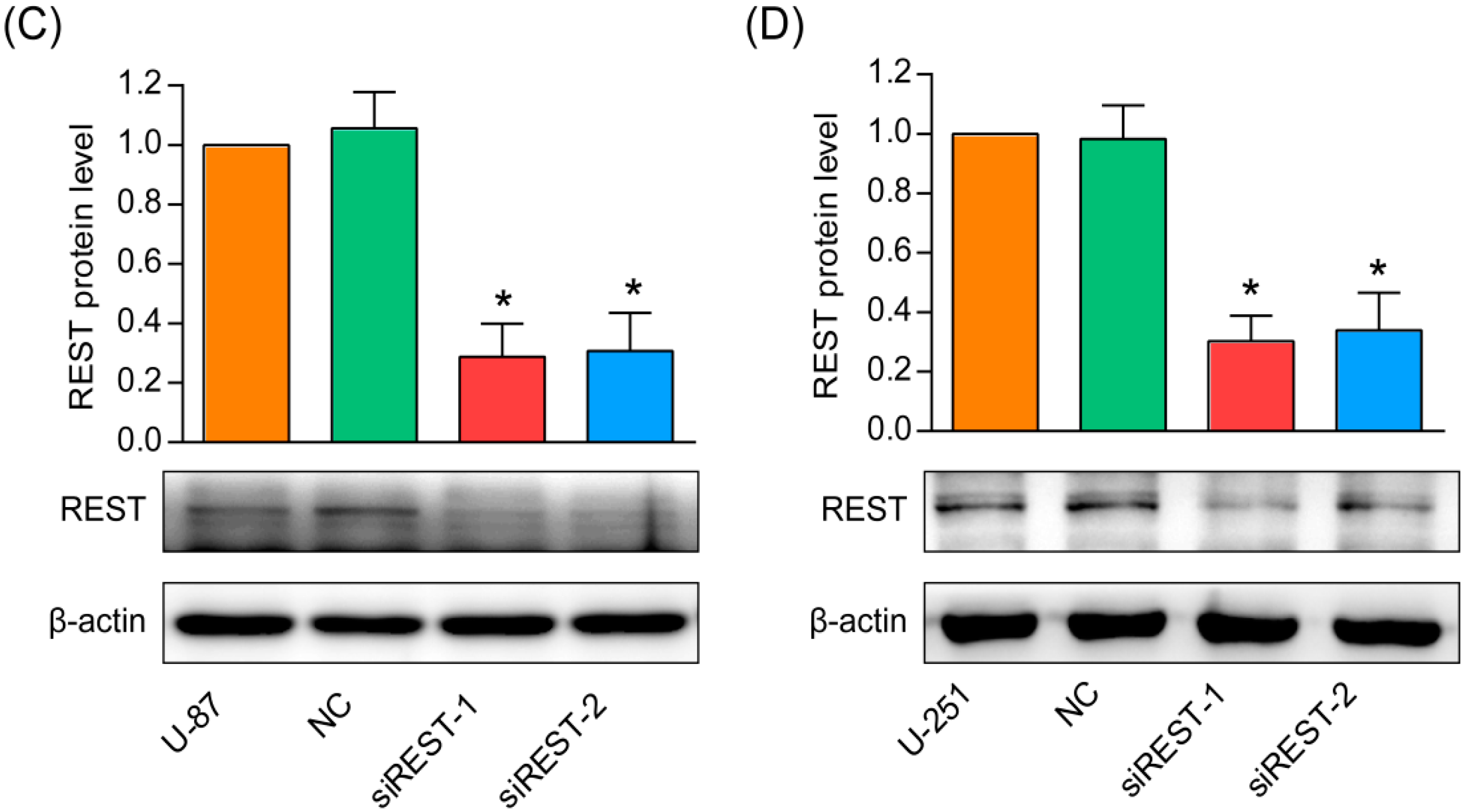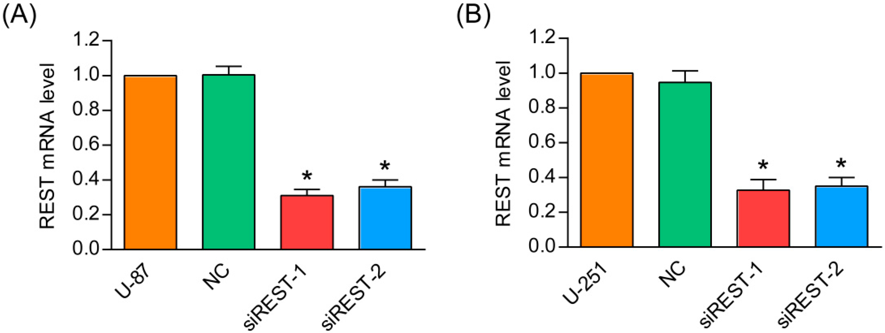 Previous studies have shown that REST is overexpressed in GBM cells and tissues [10,11]. To investigate the functional role of REST in GBM, siRNA was used to knockdown REST expression in U-87 and U-251 cells. Two different siRNAs (siREST-1 and siREST-2) designed against different regions of REST were tested for their efficiency in knocking down. As shown in Figure 1A,B, REST mRNA level was significantly reduced to about 30% in U-87 and U-251 cells at 48 h after transfection with siREST-1 or siREST-2, compared with NC (scramble siRNA as negative control). Further, the silencing efficiencies of the two siRNAs against REST were confirmed at the protein level, and changes observed by Western blotting were consistent with the results in real-time PCR (Figure 1C,D). These results indicated that the specific siRNA targeting REST/NRSF was able to effectively knockdown endogenous REST at both mRNA and protein levels in U-87 and U-251 GBM cells.