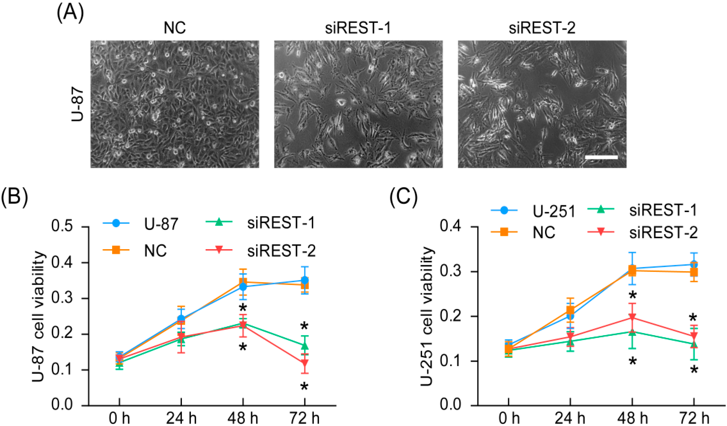 Cell proliferation was inhibited by REST silencing. (A) Representative phase-contrast micrographs of transfected U-87 cells; (B) cell viability of transfected U-87 cells; (C) cell viability of transfected U-251 cells. * p < 0.05 compared with NC group. Scale bar indicates 200 nm.
