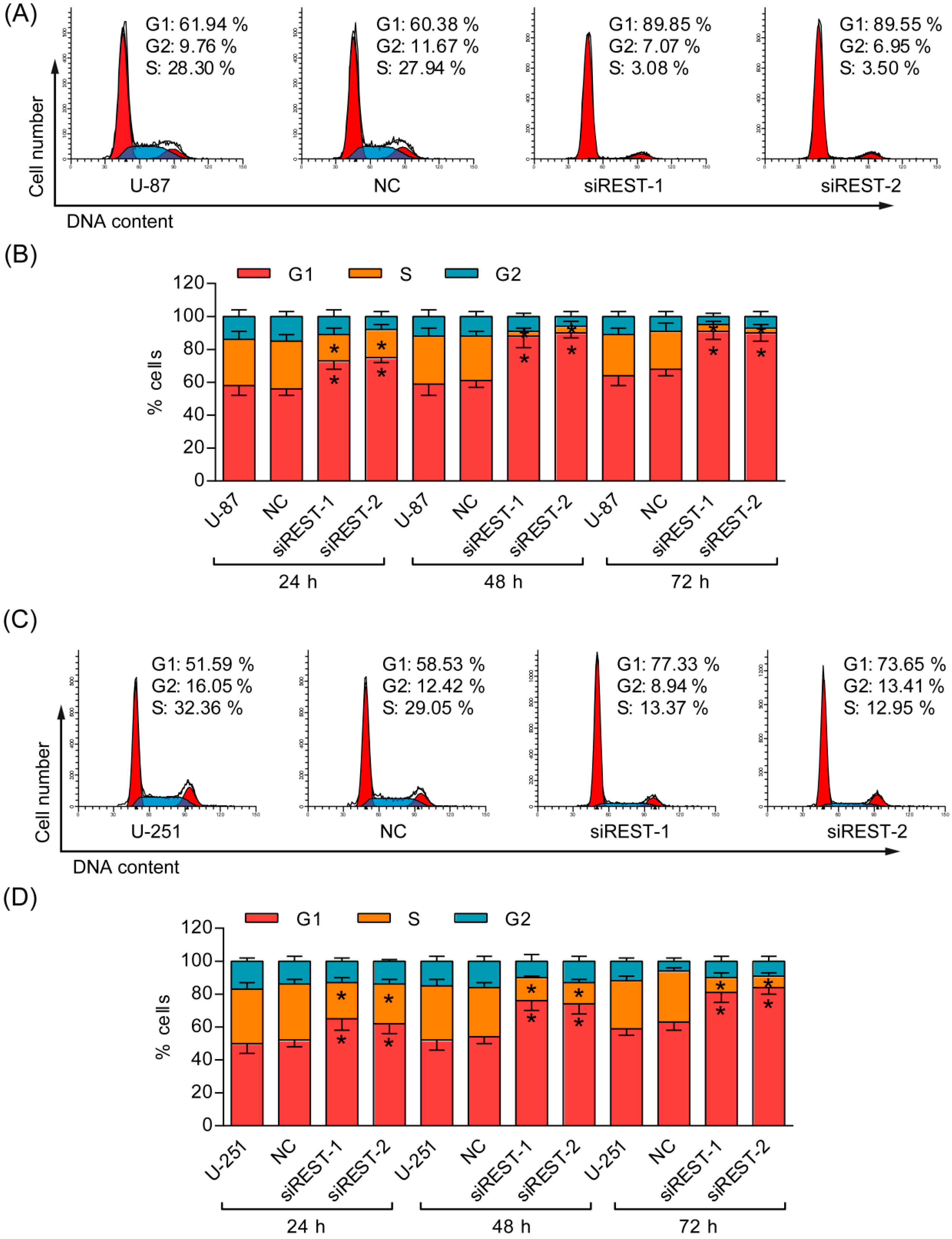 Knockdown of REST induced G1 phase arrest. (A) Representative cell cycle plots of U-87 cells at 48 h after REST knockdown; (B) The cell cycle distribution of 3 independent experiments at 24, 48 and 72 h in U-87 cells; (C) Representative cell cycle plots of U-251 cells at 48 h after REST knockdown; (D) The cell cycle distribution of 3 independent experiments at 24, 48 and 72 h in U-251 cells. * p < 0.05 compared with NC group.