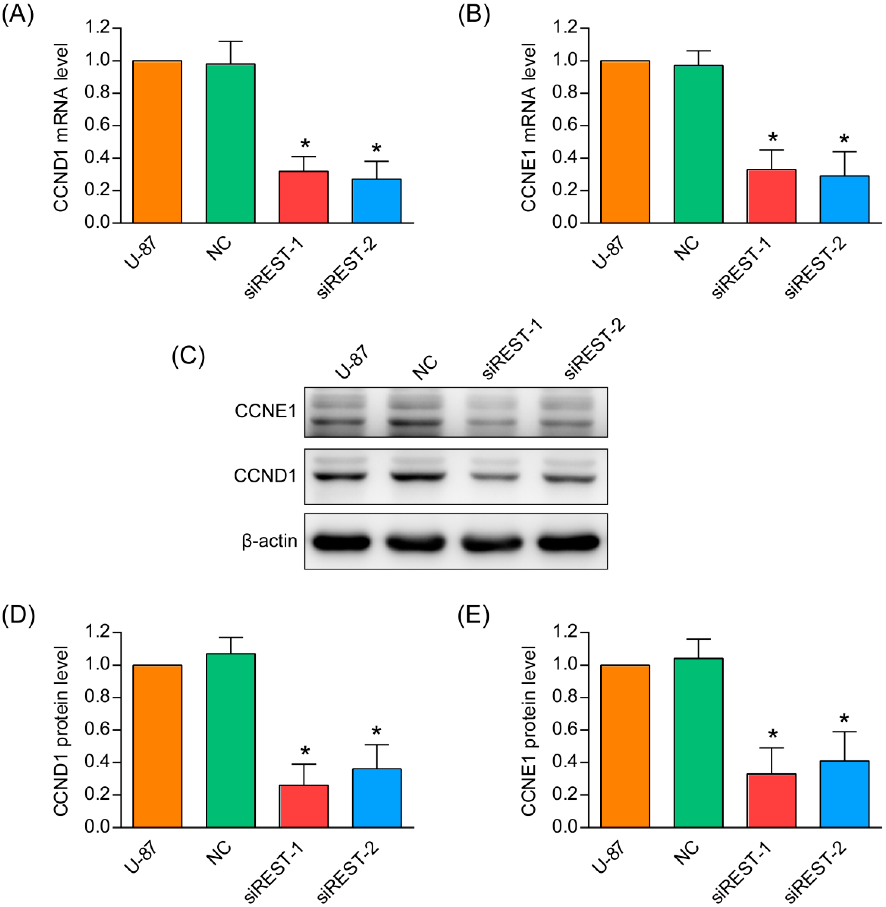 CCND1 and CCNE1 were reduced by REST knockdown. (A,B) The mRNA levels of two genes involved in G1–S cell cycle transition, CCND1 and CCNE1 were analyzed by real-time PCR; (C) The expression of CCND1 and CCNE1 was verified by Western blotting; (D,E) The quantifications of Western blotting were applied with Image J. * p < 0.05 compared with NC group.