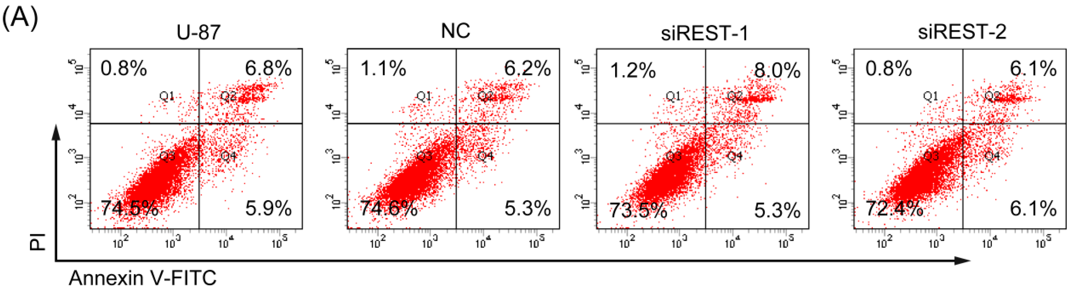 Given that the cell viability was obviously reduced by REST silencing in GBM cells, Annexin V/PI staining was employed to determine whether the inhibitory effect was related to apoptosis. As shown in Figure 5, there were no significantly changes of early, as well as, late apoptosis that occurred in U-87 and U-251 cells upon REST knockdown. Additionally, in the results of cell cycle analysis, the characteristic hypodipolid peak (subG1), indicating apoptotic cells, did not appear after 48 h of transfection (Figure 3A,C), consistent with the apoptosis assay described above. Thus, apoptosis may not contribute to reduced cell viability upon REST knockdown.