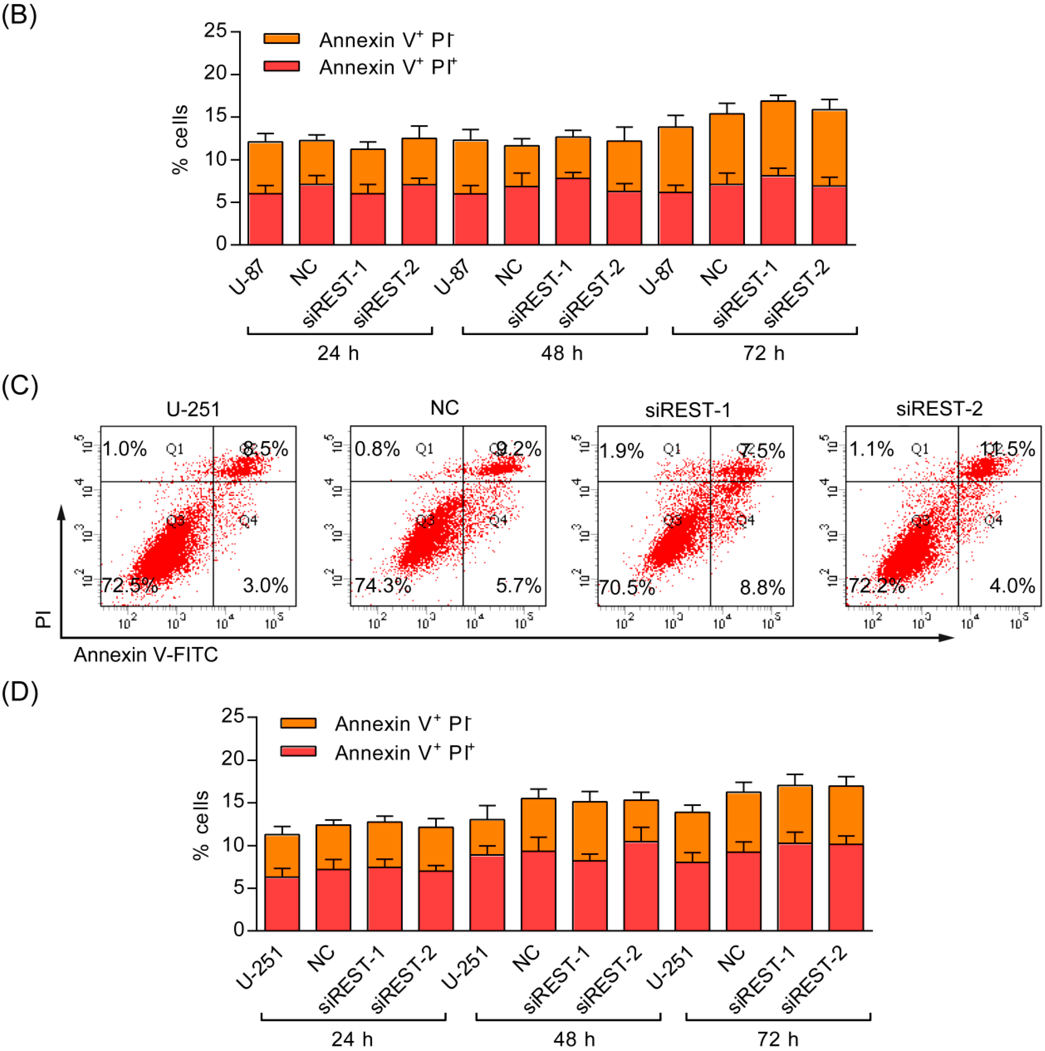 REST silencing does not induce cell apoptosis. (A) Representative cell apoptosis plots of U-87 cells at 48 h after REST knockdown; (B) The apoptosis of 3 independent experiments at 24, 48 and 72 h in U-87 cells; (C) Representative cell apoptosis plots of U-251 cells at 48 h after REST knockdown; (D) The apoptosis of 3 independent experiments at 24 h, 48 h and 72 h in U-251 cells.