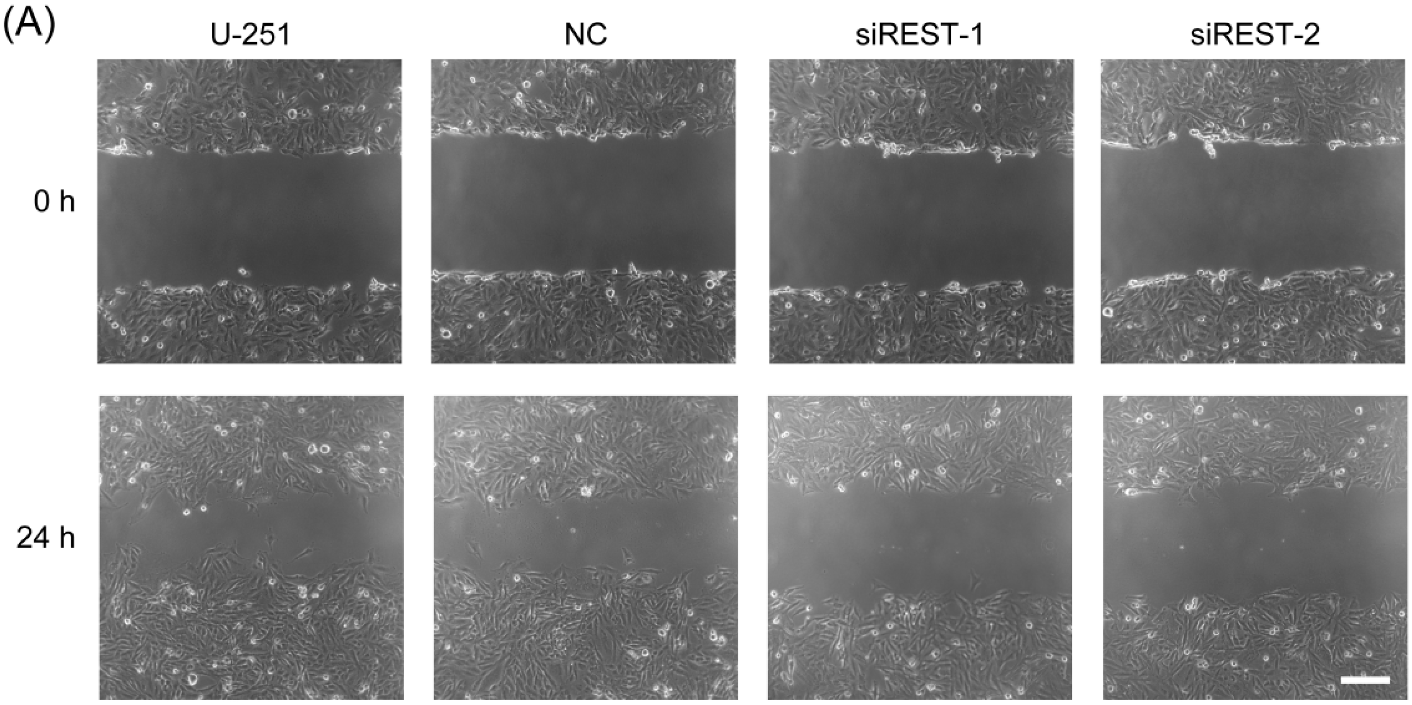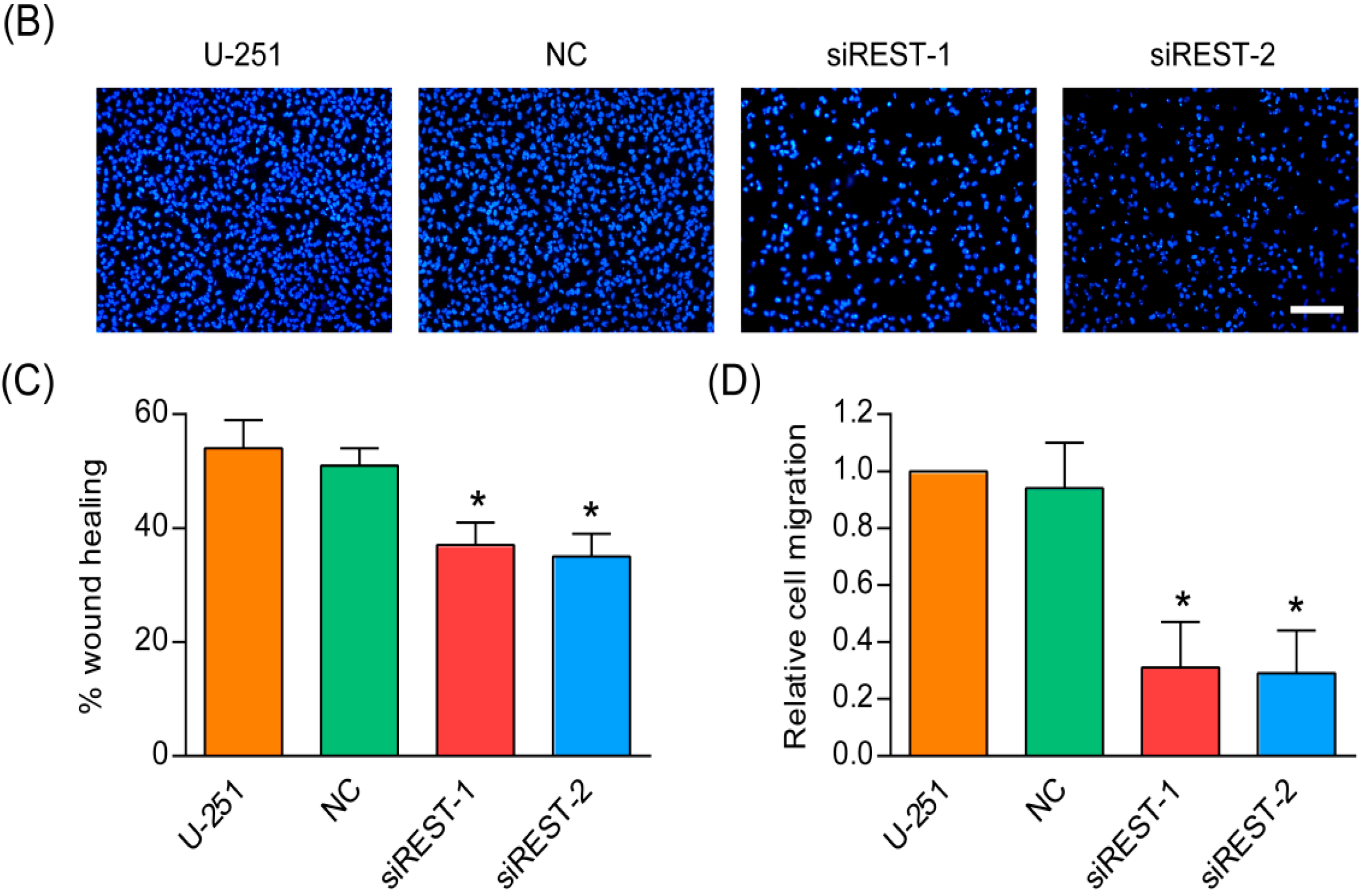 REST silencing reduced migration of U-251 cells. (A) In vitro scratch assay carried out with U-251 cells over 24 h; (B) Transwell migration assay was conducted with U-251 cells over 12 h; (C) The quantification of wound healing assay; (D) The quantification of transwell assay. * p < 0.05 compared with NC group. Scale bars in A and B indicate 200 nm.